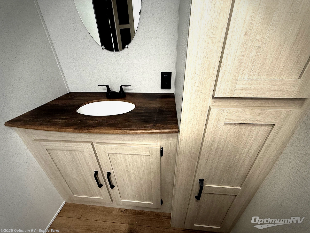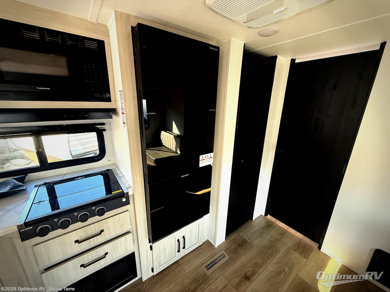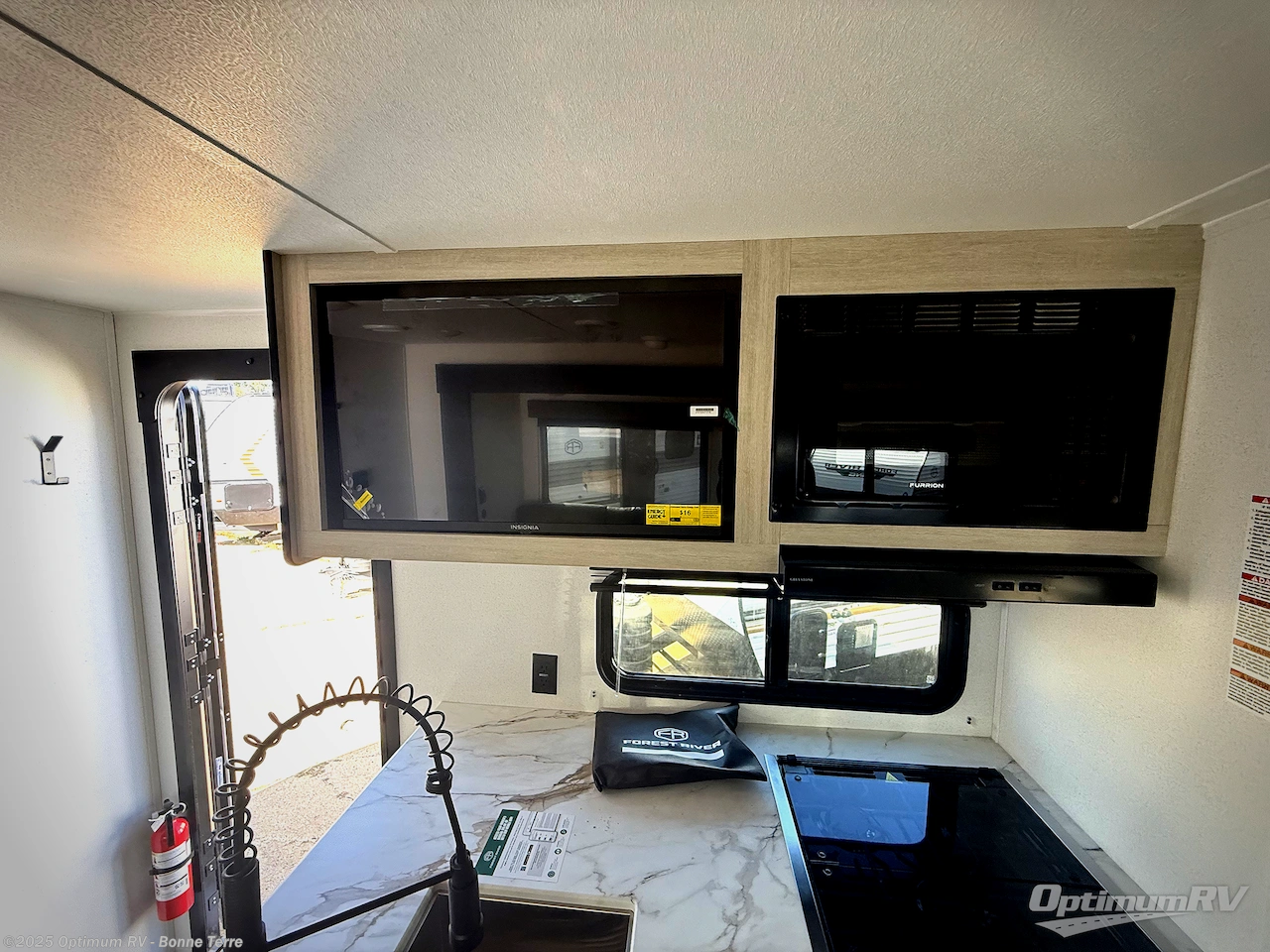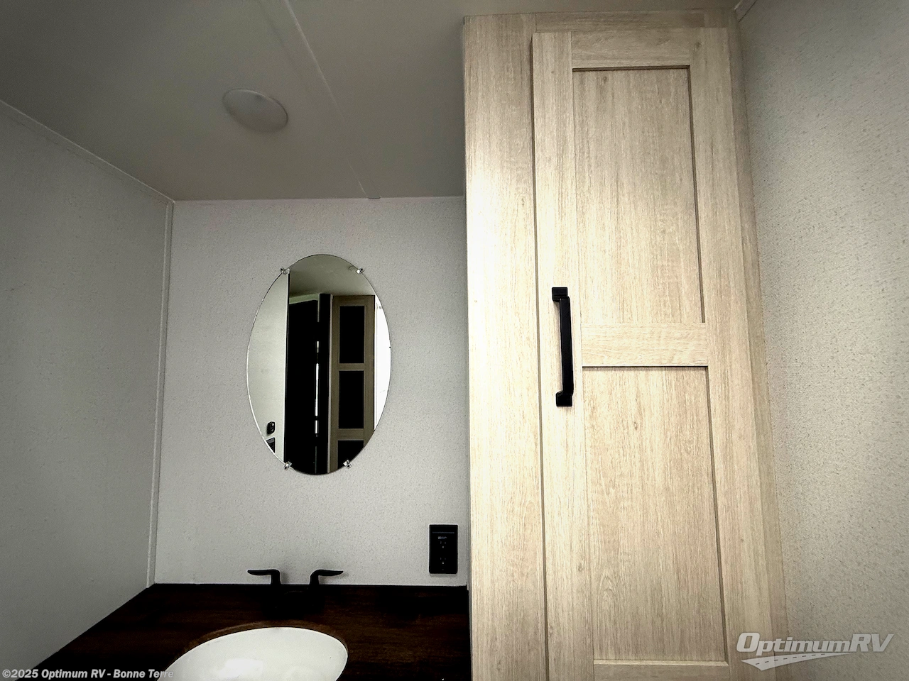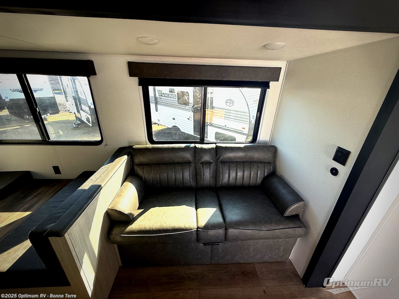 Wherever you decide to camp, you can be sure to have a great time in this rear bath travel trailer! The combined kitchen and living area is made spacious thanks to the large slide out. Here, you can relax on the sofa and dine at the booth dinette, and an optional TV can be added if you want the option for movie night. The full kitchen will allow you to make meals each day, and you can choose to add the optional outside mini kitchen with a griddle if you want to cook with fresh air. This unit also includes a front private bedroom, complete with an RV queen bed, an overhead shelf and dual shirt closets to keep clothes wrinkle-free.
