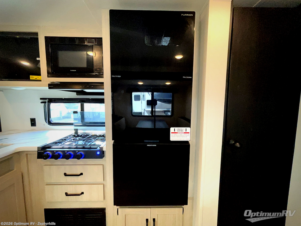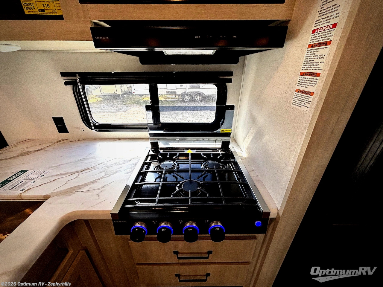 Wherever you decide to camp, you can be sure to have a great time in this rear bath travel trailer! The combined kitchen and living area is made spacious thanks to the large slide out. Here, you can relax on the sofa and dine at the booth dinette, and an optional TV can be added if you want the option for movie night. The full kitchen will allow you to make meals each day, and you can choose to add the optional outside mini kitchen with a griddle if you want to cook with fresh air. This unit also includes a front private bedroom, complete with an RV queen bed, an overhead shelf and dual shirt closets to keep clothes wrinkle-free.