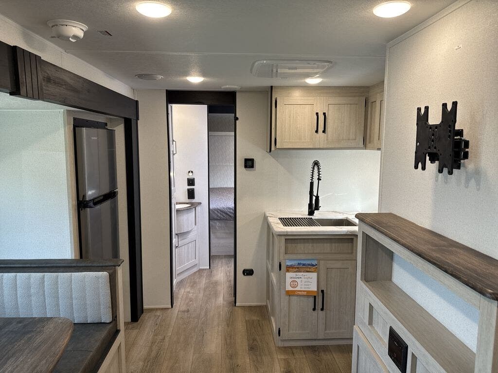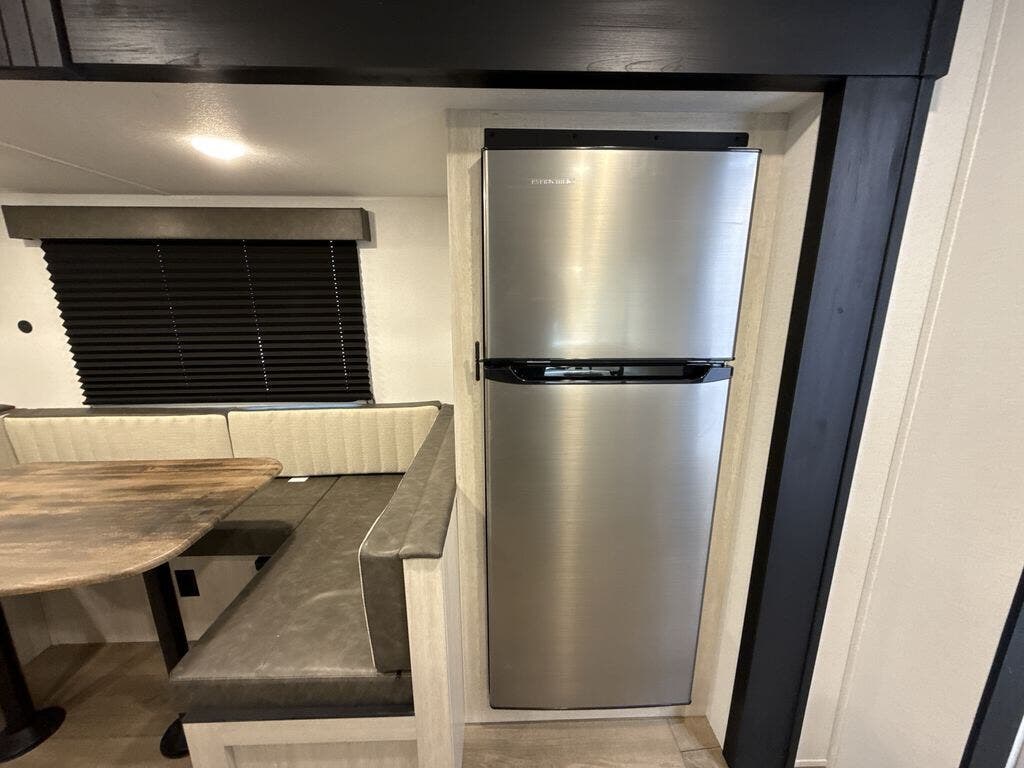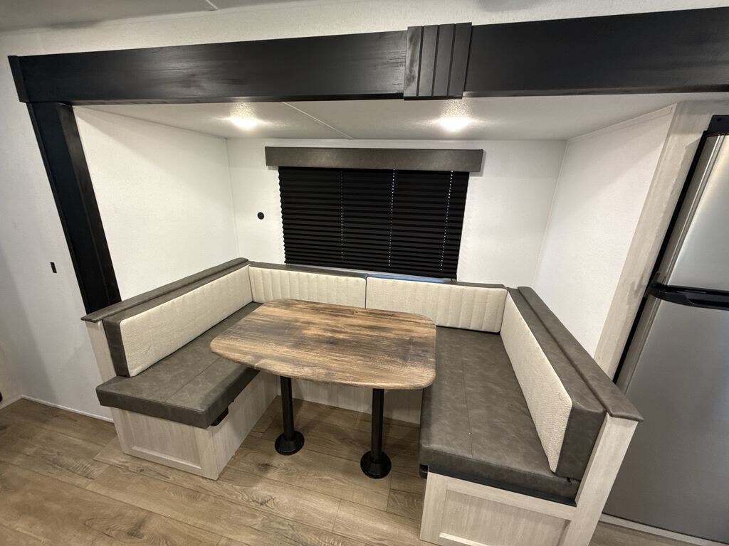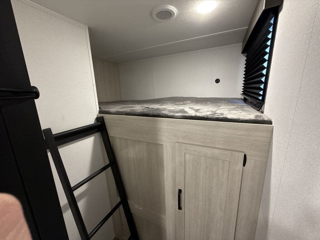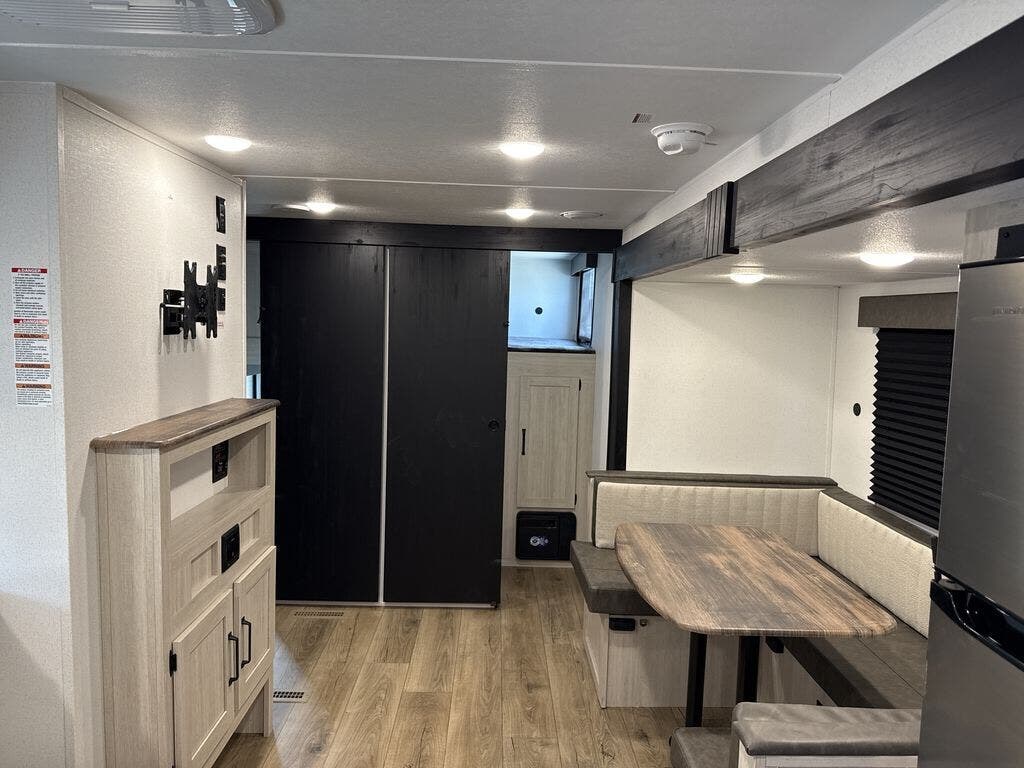 Your whole crew will love camping in this travel trailer since everyone can enjoy their own private space. The rear bunkhouses feature a private lower bunk room plus a private upper bunk room, each with their own door and a linen closet for storage space. The front master bedroom includes an RV queen bed, dual shirt closets, and easy access into the walk-thru bath. Head to the combined kitchen and living area to make dinner in the full kitchen, dine around the U-shaped dinette slide, and enjoy the fireplace! Outside, an optional micro kitchen with a grill can be added if you choose, and you'll find outside storage compartments to keep all your gear secure!