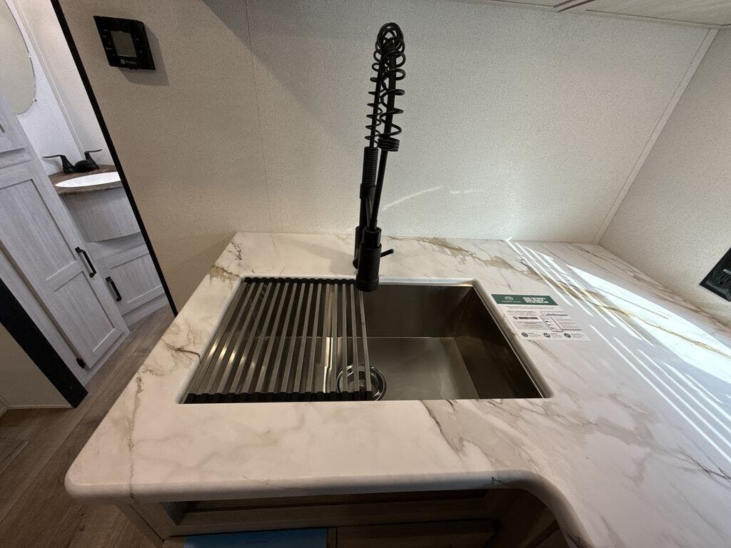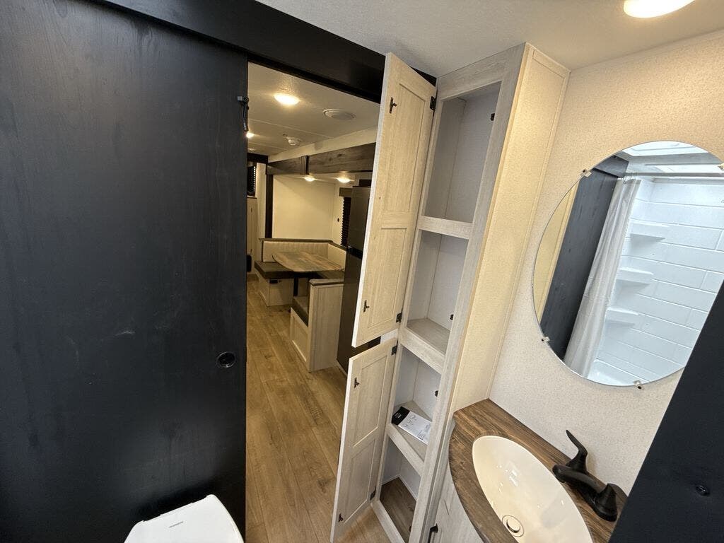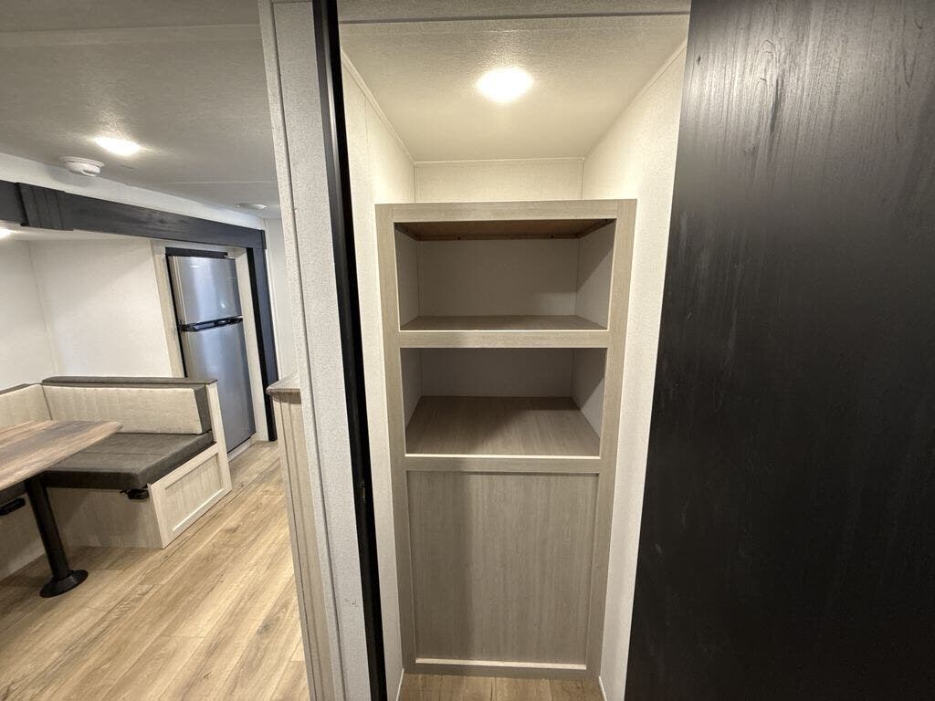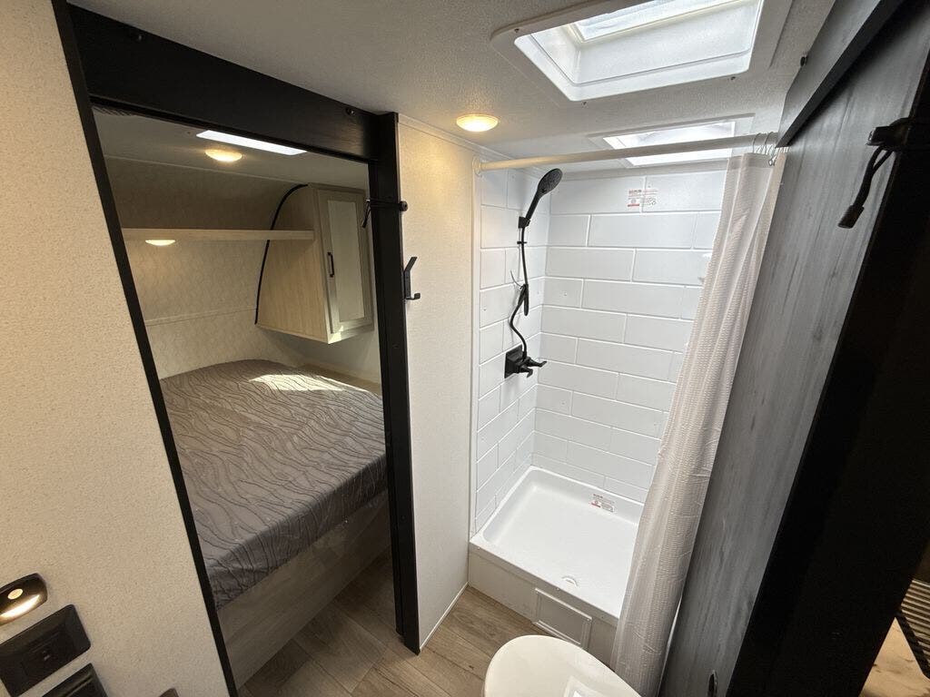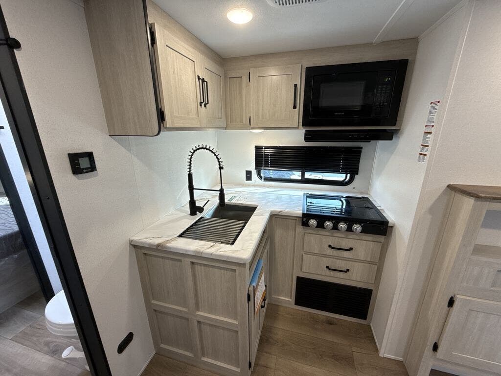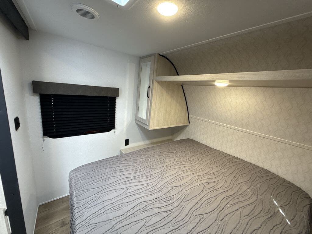 Your whole crew will love camping in this travel trailer since everyone can enjoy their own private space. The rear bunkhouses feature a private lower bunk room plus a private upper bunk room, each with their own door and a linen closet for storage space. The front master bedroom includes an RV queen bed, dual shirt closets, and easy access into the walk-thru bath. Head to the combined kitchen and living area to make dinner in the full kitchen, dine around the U-shaped dinette slide, and enjoy the fireplace! Outside, an optional micro kitchen with a grill can be added if you choose, and you'll find outside storage compartments to keep all your gear secure!