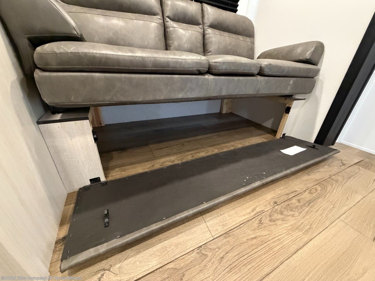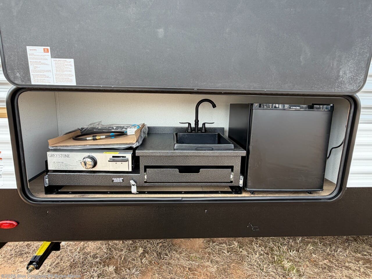 If you're looking for more space, this double axle unit features a large slide so you can walk about freely. Here, you'll find the booth dinette and sofa, which sit across from the optional TV if you want to enjoy movie nights. The full kitchen includes a stainless microwave and three burner cooktop to make meals, plus a pantry and 12V refrigerator for food storage. And an optional outside mini kitchen with a grill can be added if you enjoy cooking outdoors! Your guests or littles are sure to enjoy the rear bedroom with a queen bed, a 28" x 65" bunk, 28" x 76" bunk, a shirt closet, and a wardrobe so everything has a place!