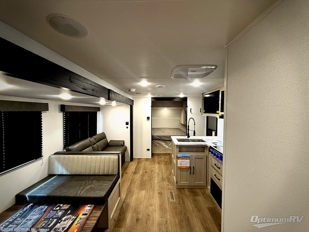 If you're looking for more space, this double axle unit features a large slide so you can walk about freely. Here, you'll find the booth dinette and sofa, which sit across from the optional TV if you want to enjoy movie nights. The full kitchen includes a stainless microwave and three burner cooktop to make meals, plus a pantry and 12V refrigerator for food storage. And an optional outside kitchen with a griddle can be added if you enjoy cooking outdoors! Your guests or littles are sure to enjoy the rear private bunkhouse with four bunk beds and a wardrobe for their things!