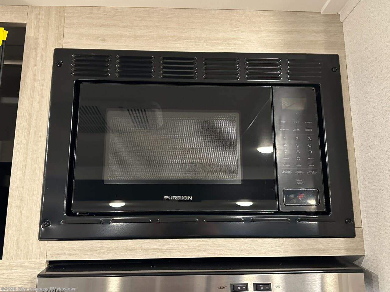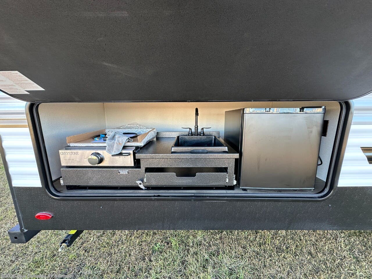 If you're looking for more space, this double axle unit features a large slide so you can walk about freely. Here, you'll find the booth dinette and sofa, which sit across from the optional TV if you want to enjoy movie nights. The full kitchen includes a stainless microwave and three burner cooktop to make meals, plus a pantry and 12V refrigerator for food storage. And an optional outside mini kitchen with a grill can be added if you enjoy cooking outdoors! Your guests or littles are sure to enjoy the rear private bunkhouse with four bunk beds and a wardrobe for their things!