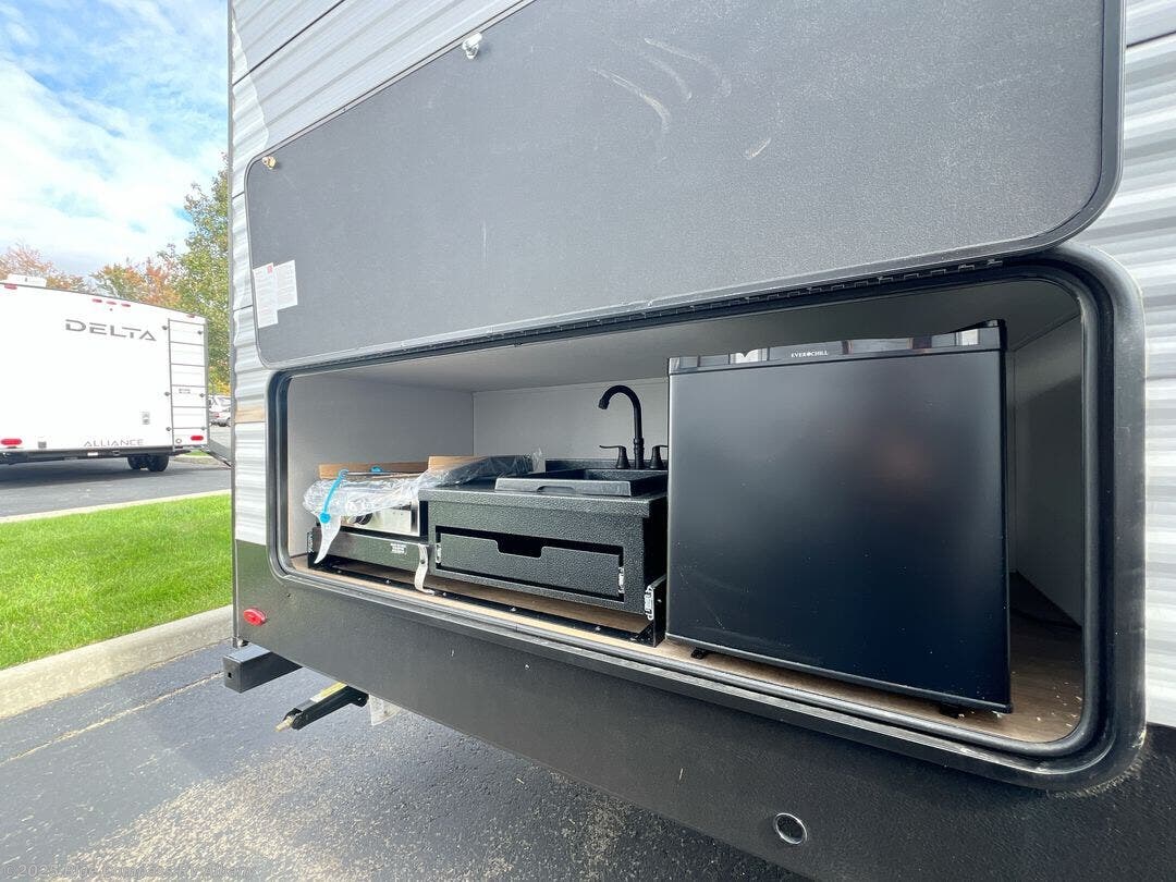 If you're looking for more space, this double axle, double slide out unit is perfect for your group of eight. Within the large slide in the living room, you'll find the booth dinette and sofa, which sit across from the optional TV if you want to enjoy movie nights. The full kitchen includes a stainless microwave and three burner cooktop to make meals, plus a pantry and 12V refrigerator for food storage. And an optional outside kitchen with a griddle can be added if you enjoy cooking outdoors! Your guests or littles are sure to enjoy the rear private bunkhouse that features a set of 38" x 76" bunks across from the third bunk and jiffy sofa within a slide out!