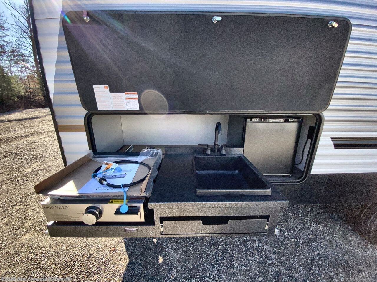 If you're looking for more space, this double axle, double slide out unit is perfect for your group of eight. Within the large slide in the living room, you'll find the booth dinette and sofa, which sit across from the optional TV if you want to enjoy movie nights. The full kitchen includes a microwave and three burner cooktop to make meals, plus a pantry and 12V refrigerator for food storage. And an optional outside mini kitchen with a grill can be added if you enjoy cooking outdoors! Your guests or littles are sure to enjoy the rear private bunkhouse that features a set of 38" x 76" bunks across from the third bunk and jiffy sofa within a slide out!
