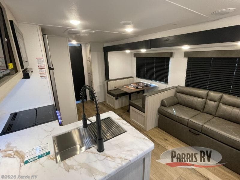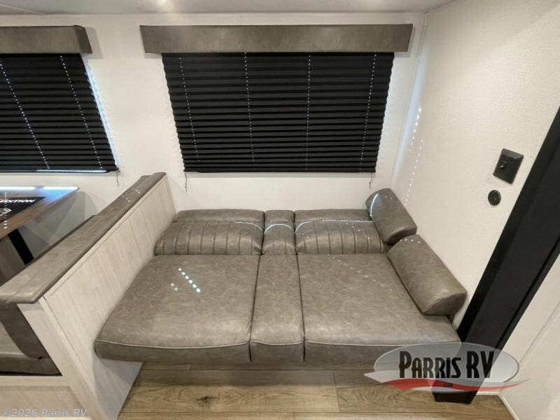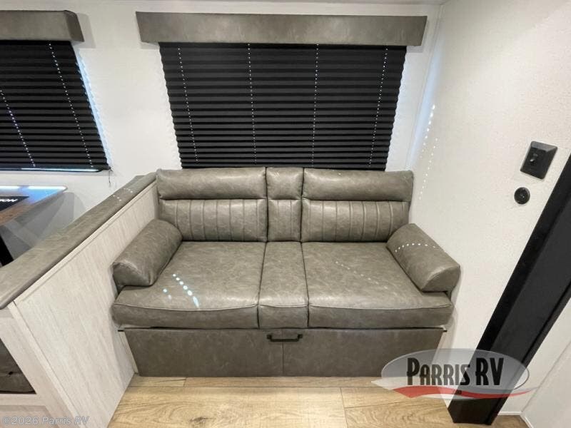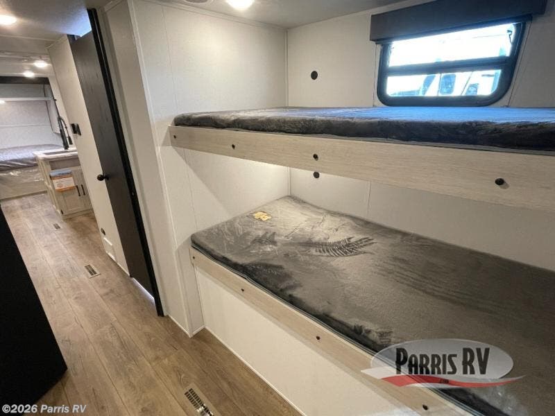 If you're looking for more space, this double axle, double slide out unit is perfect for your group of eight. Within the large slide in the living room, you'll find the booth dinette and sofa, which sit across from the optional TV if you want to enjoy movie nights. The full kitchen includes a microwave and three burner cooktop to make meals, plus a pantry and 12V refrigerator for food storage. And an optional outside mini kitchen with a grill can be added if you enjoy cooking outdoors! Your guests or littles are sure to enjoy the rear private bunkhouse that features a set of 38" x 76" bunks across from the third bunk and jiffy sofa within a slide out!