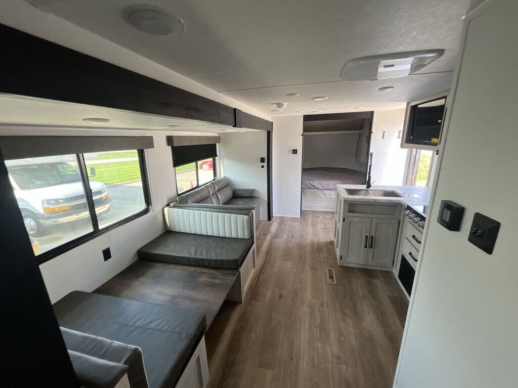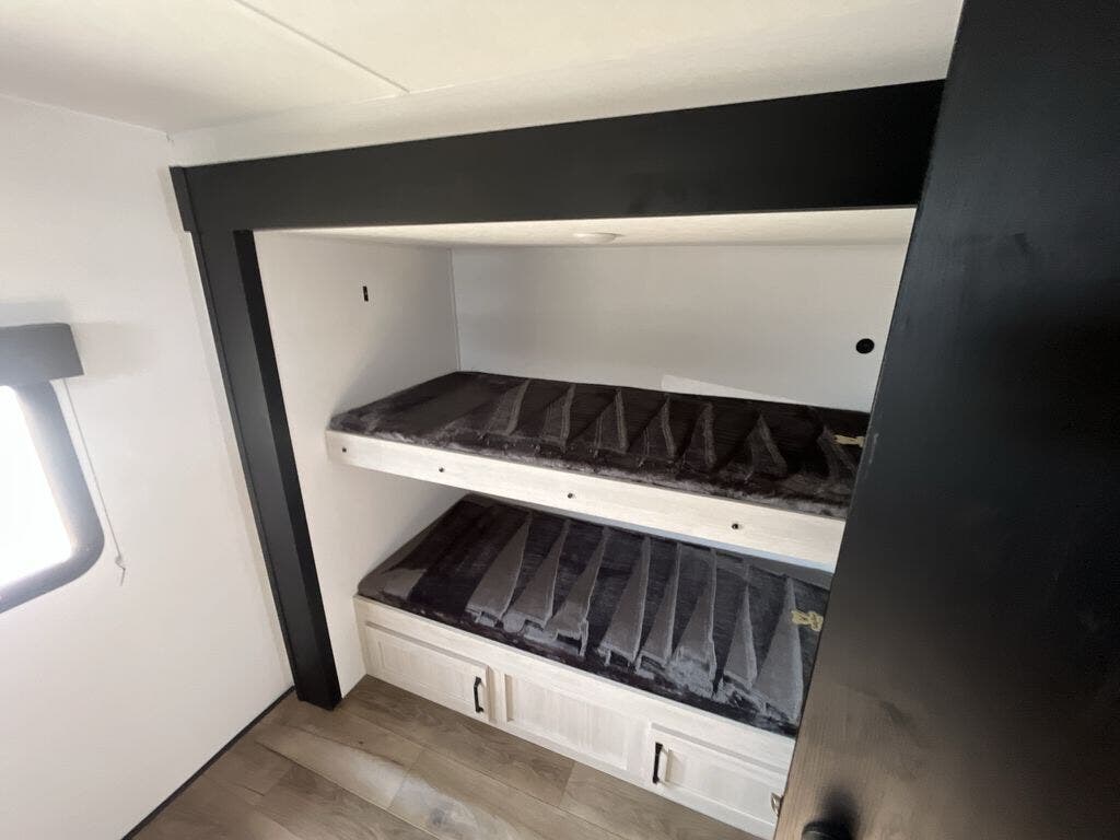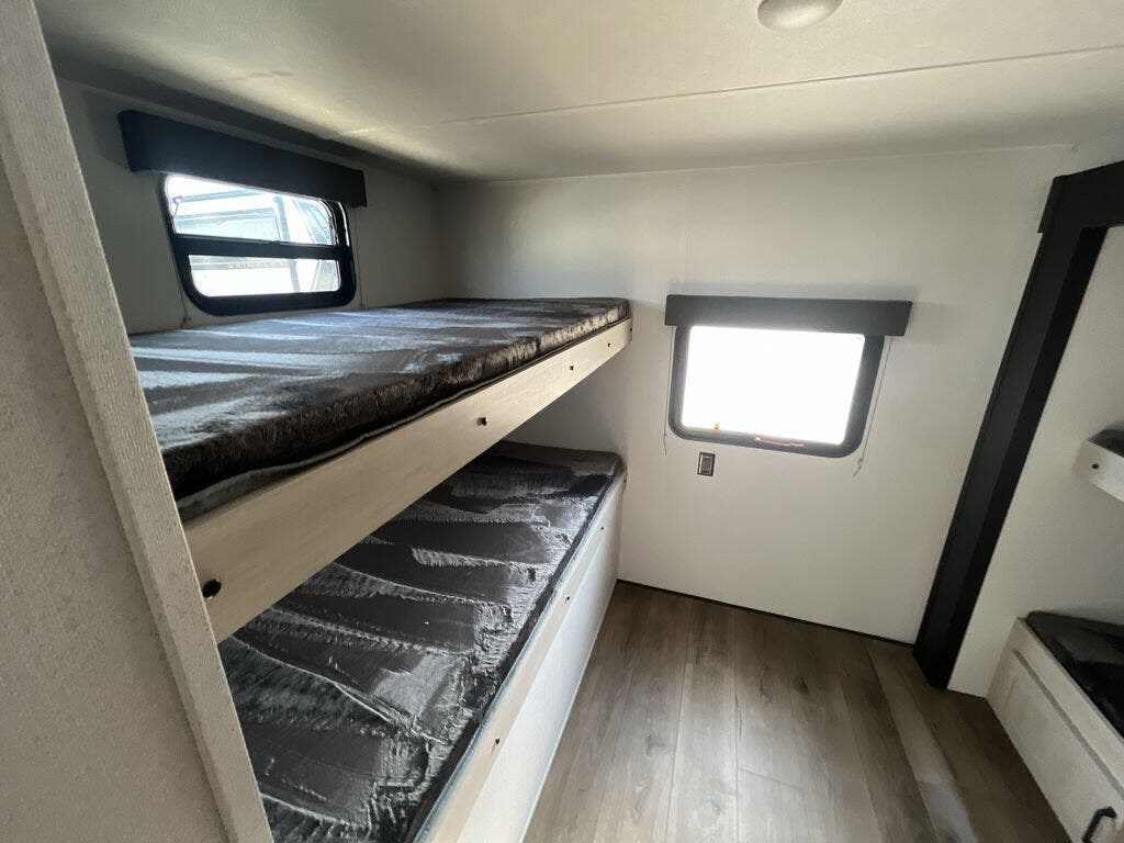If you're looking for more space, this double axle, double slide out unit is perfect for your group of eight. Within the large slide in the living room, you'll find the booth dinette and sofa, which sit across from the optional TV if you want to enjoy movie nights. The full kitchen includes a microwave and three burner cooktop to make meals, plus a pantry and 12V refrigerator for food storage. And an optional outside mini kitchen with a grill can be added if you enjoy cooking outdoors! Your guests or littles are sure to enjoy the rear private bunkhouse that features a set of 38" x 76" bunks across from the third bunk and jiffy sofa within a slide out!