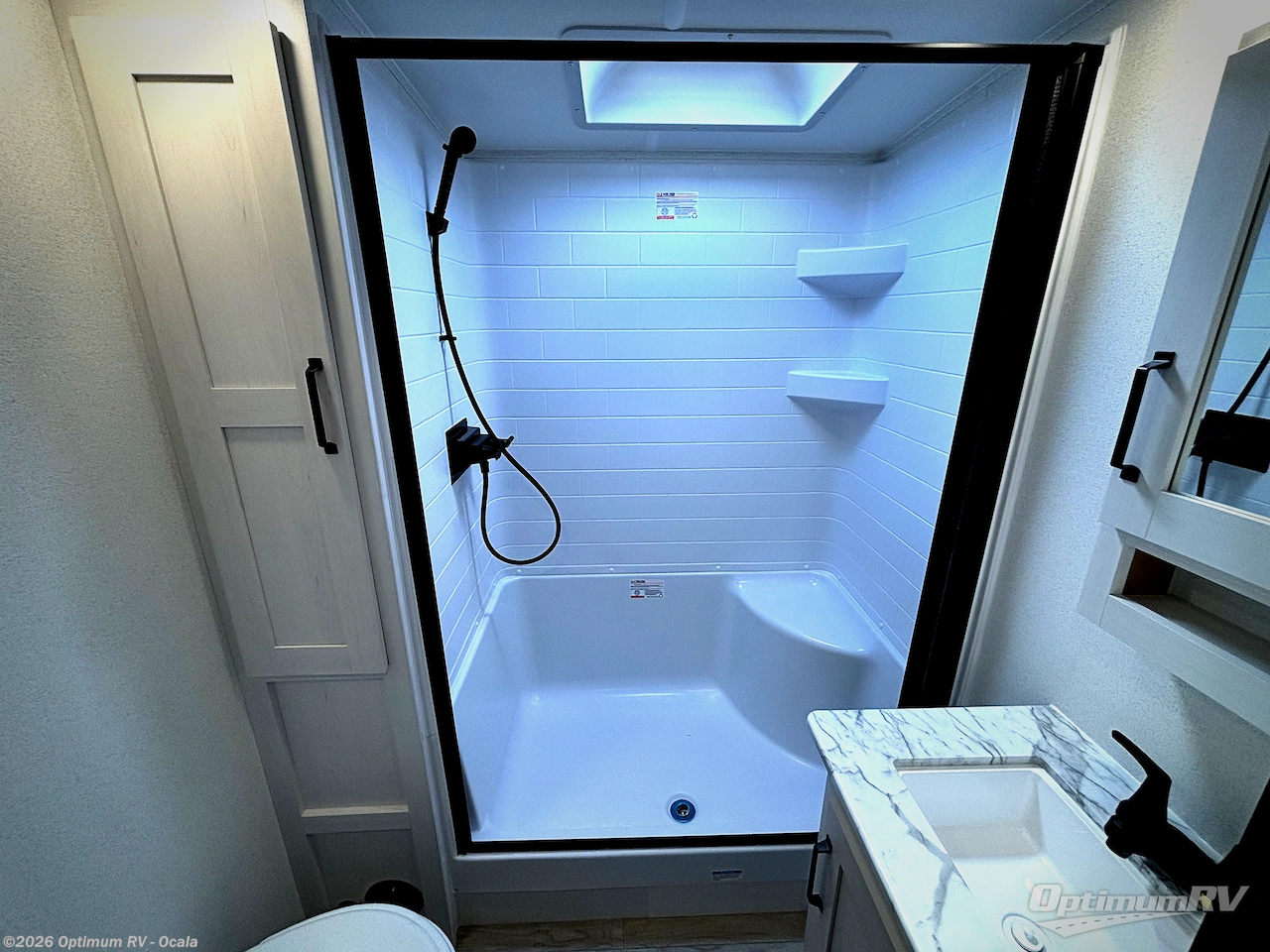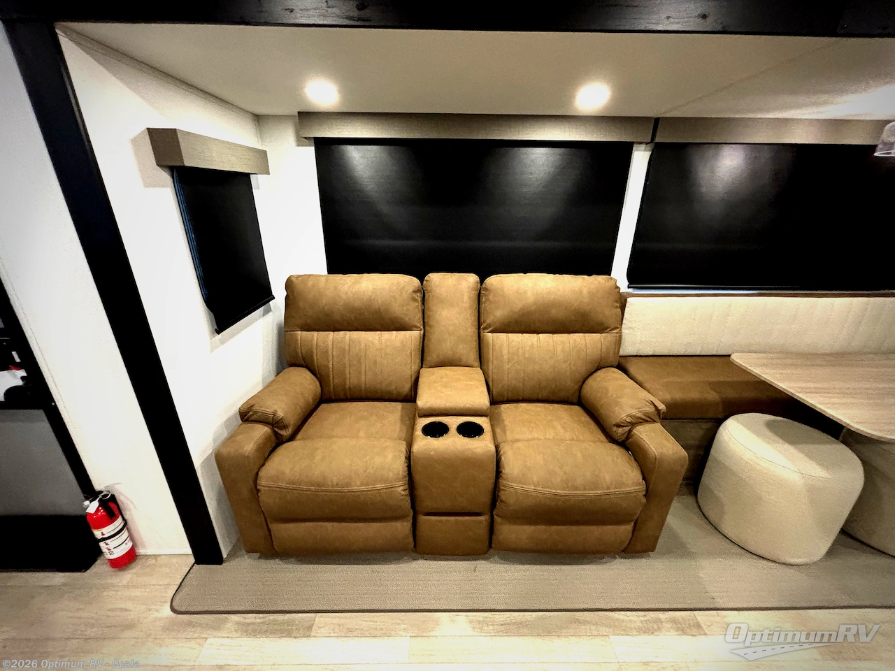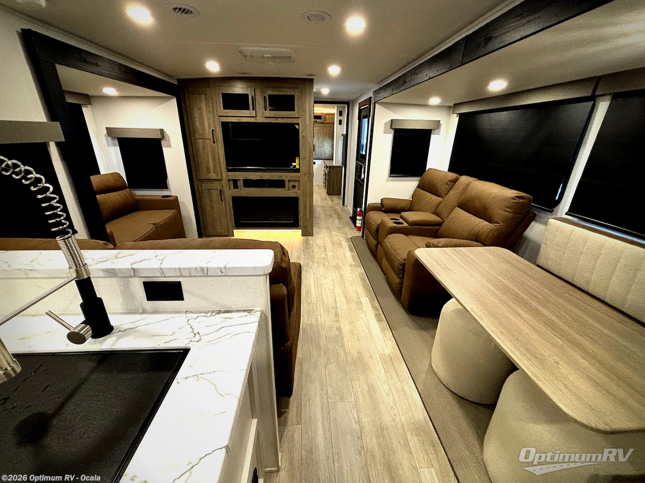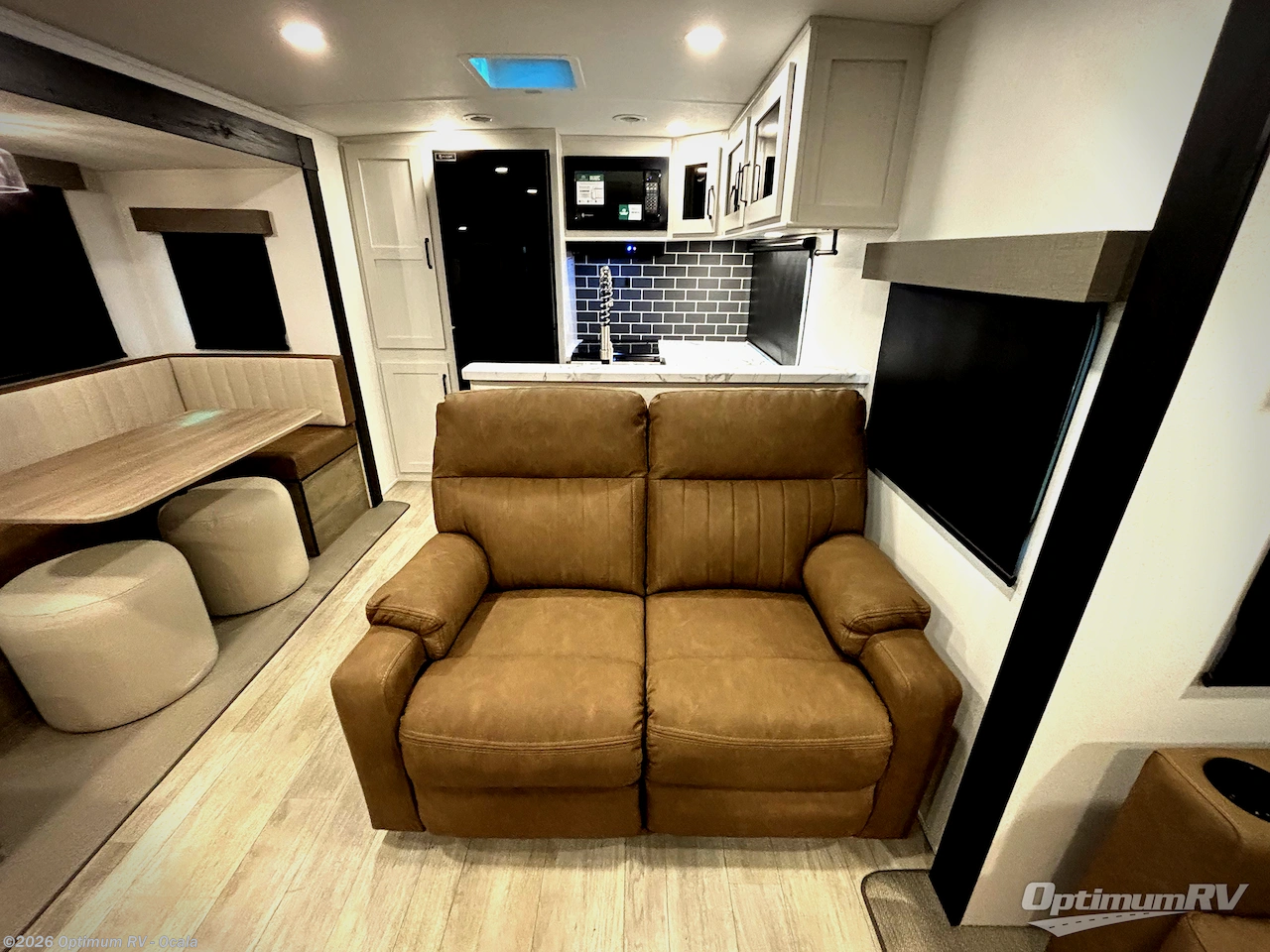 One look at this spacious travel trailer and you'll be sold! The rear kitchen features a U-shaped counter, an 11-cu. ft. refrigerator, plus a pantry for dry goods and snacks. There is a 1/2 dinette with bench seating, plus a tri-fold sofa and two theater seats. Everyone can take turns cleaning up in the full bath that includes a shower with a seat, then head outdoors to relax under the patio awnings with LED lights. When it's time for bed, you will enjoy the king bed slide out in the front bedroom. You'll also find a dresser and a closet here, plus a wardrobe with washer and dryer prep if you choose to add those appliances!