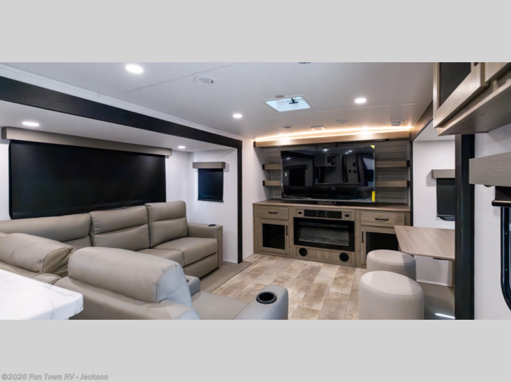 This travel trailer will feel just like home with its front living area, master bedroom, and triple slides for more space! You'll enjoy the L-shaped sofa with a tri-fold on one end and theater seats on the other. And there is a front entertainment center with a TV and fireplace to make it cozier. A middle kitchen includes all the appliances to make meals each day, plus an electric refrigerator and pantry for food storage. Head towards the back to find the master bedroom with a king bed slide out, dual wardrobes, and a desk with drawers if you need to get some work done. And the full rear bath is super accommodating with its dual bath sinks plus washer and dryer prep!