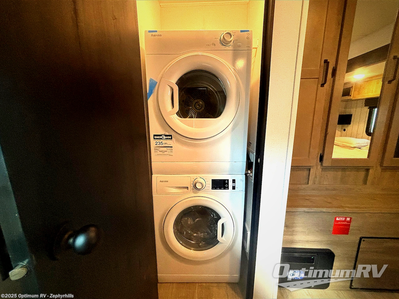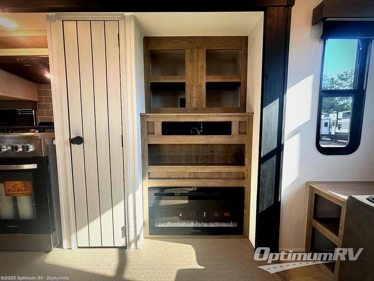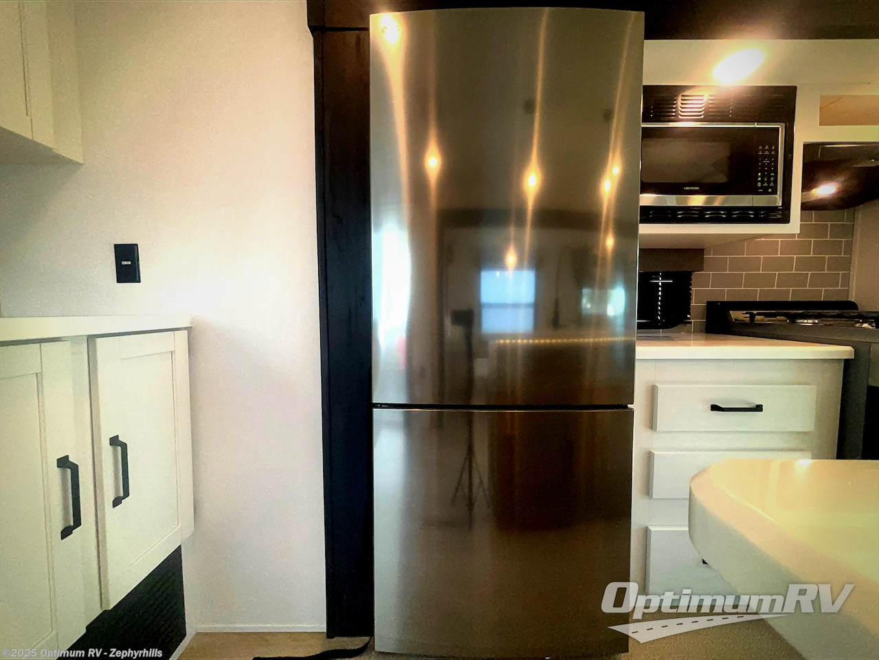 Get ready to enjoy your destination for a weekend or even longer in comfort with the front living and kitchen combined area. The sofa and booth dinette offer relaxing and dining space as well as sleeping space when needed. There are two recliners you are sure to love, as well as a fireplace to make it feel more like home. There is a kitchen island to prepare and serve meals from and wash the dishes. The kitchen offers full amenities including a stainless steel refrigerator and plenty of storage. You will surely enjoy the natural lighting from the patio door, and the second entry/exit is located in the rear private bedroom where you can sleep like a royalty on the king bed. There is also a closet with the option to add washer and dryer prep if you choose!