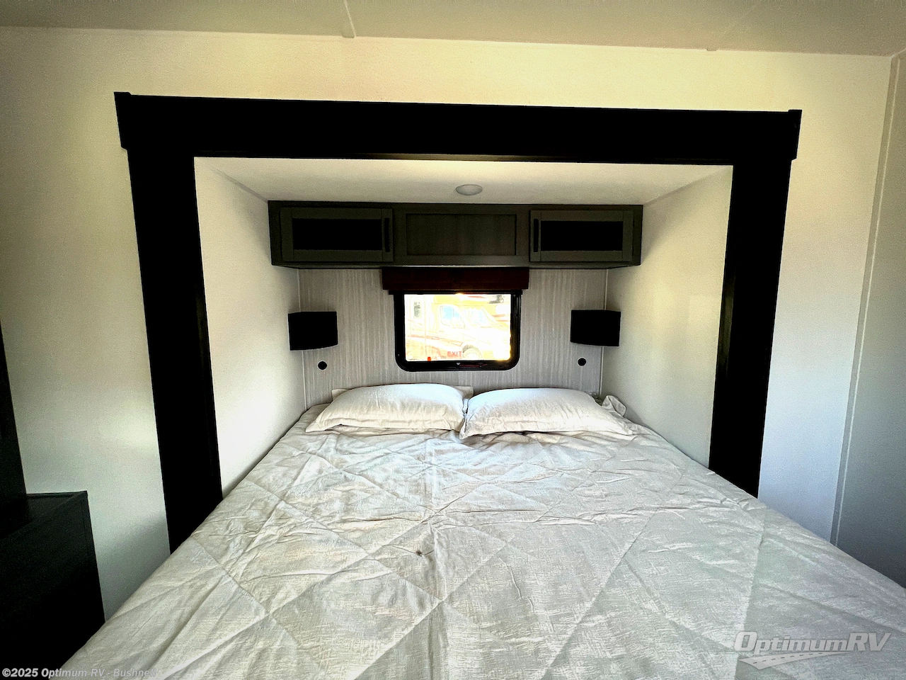 Get ready to enjoy your destination for a weekend or even longer in comfort with the front living and kitchen combined area. The sofa and booth dinette offer relaxing and dining space as well as sleeping space when needed. There are two recliners you are sure to love, as well as a fireplace to make it feel more like home. There is a kitchen island to prepare and serve meals from and wash the dishes. The kitchen offers full amenities including a stainless steel refrigerator and plenty of storage. You will surely enjoy the natural lighting from the patio door, and the second entry/exit is located in the rear private bedroom where you can sleep like a royalty on the king bed. There is also a closet with the option to add washer and dryer prep if you choose!