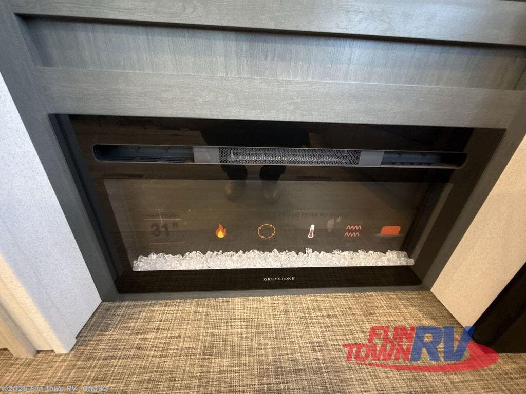 Get ready to enjoy your destination for a weekend or even longer in comfort with the front living and kitchen combined area. The sofa and booth dinette offer relaxing and dining space as well as sleeping space when needed. There are two recliners you are sure to love, as well as a fireplace to make it feel more like home. There is a kitchen island to prepare and serve meals from and wash the dishes. The kitchen offers full amenities including a stainless steel refrigerator and plenty of storage. You will surely enjoy the natural lighting from the patio door, and the second entry/exit is located in the rear private bedroom where you can sleep like a royalty on the king bed. There is also a closet with the option to add washer and dryer prep if you choose!