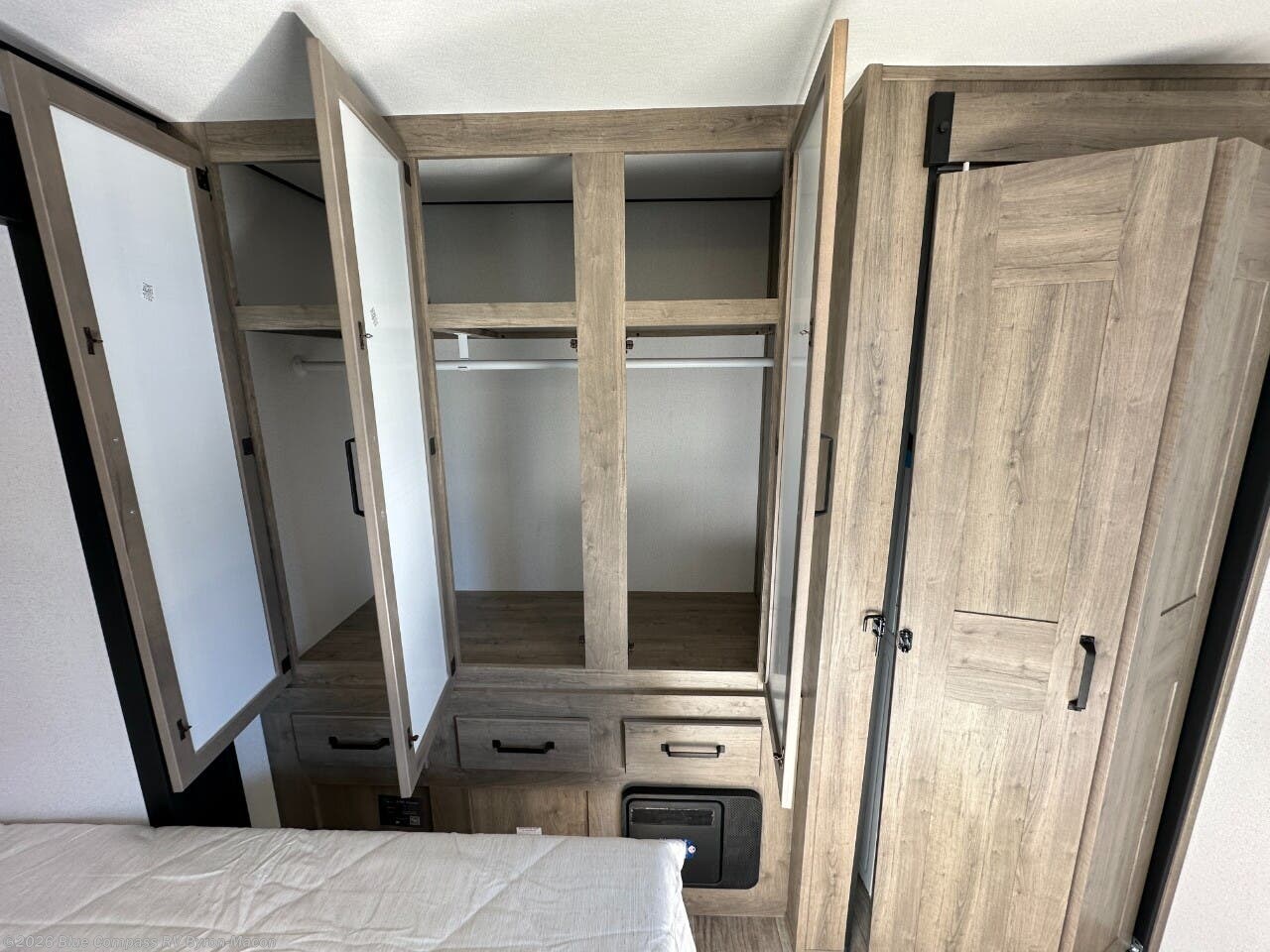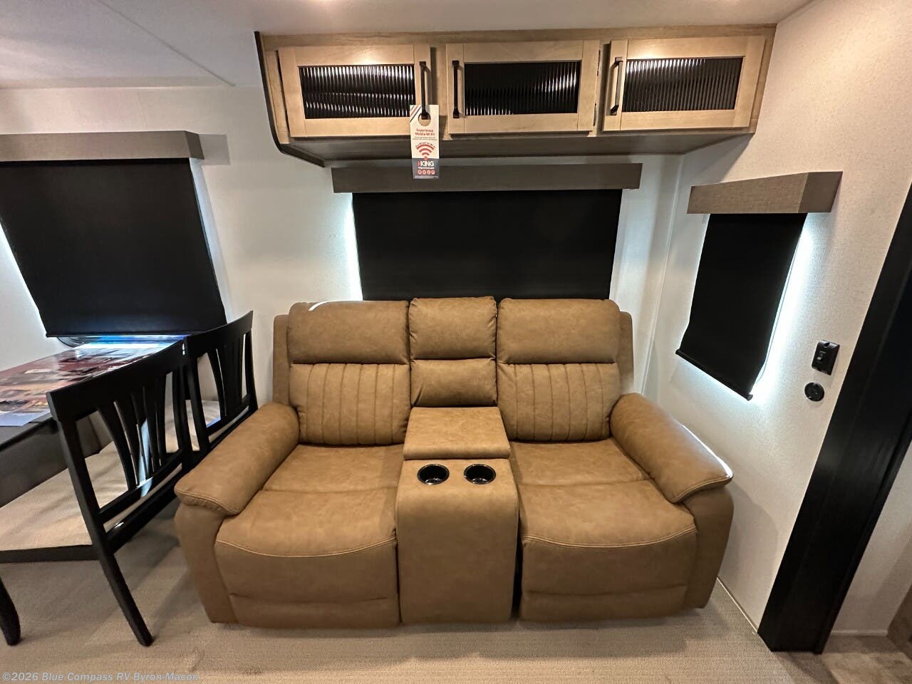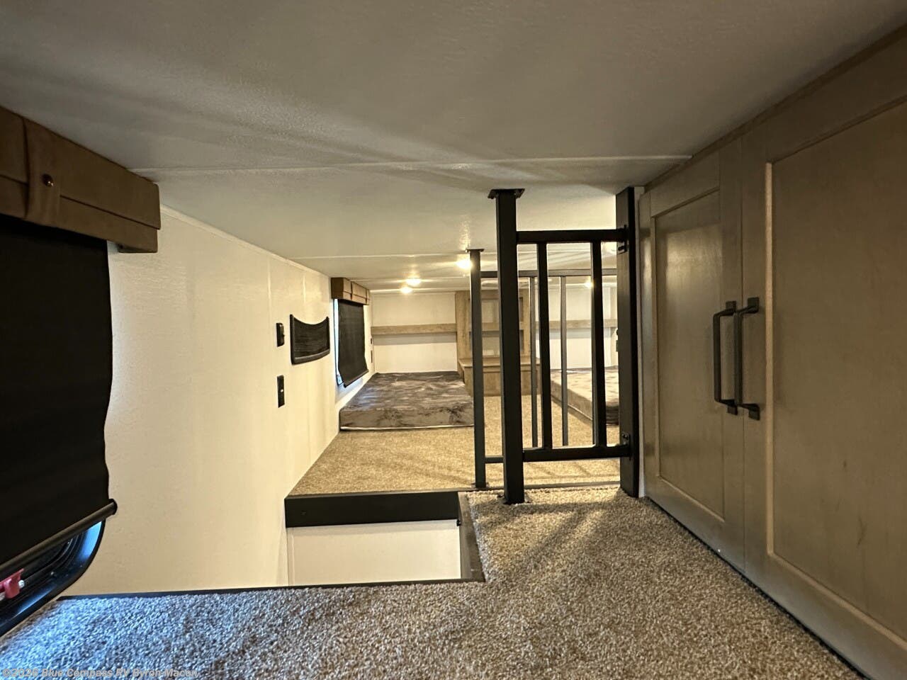 Wherever your destination may be, you can be sure to enjoy it to the fullest with this trailer in tow! With two entry doors, you can enter in through the front private bedroom or the main living area. The bedroom includes a king bed slide out, a desktop if you need to work from home, and a wardrobe/closet to keep your clothes organized. There is also a closet with the option to add washer and dryer prep. Just outside this room are steps that lead to the large loft area with a 58" x 58" bunk mat and a cabinet on one side, plus two 32" x 80" bunk mats on the other. There is also a front cabinet and a wardrobe/closet for plenty of storage space. Once you've headed back downstairs, you can relax on the dual recliners, rear sofa, or free-standing table with a bench and two seats. And the chef of your group will love the kitchen with its residential style refrigerator and pantry, kitchen island, and four burner cooktop!