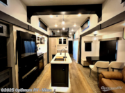 Wherever your destination may be, you can be sure to enjoy it to the fullest with this trailer in tow! With two entry doors, you can enter in through the front private bedroom or the main living area. The bedroom includes a king bed slide out, a desktop if you need to work from home, and a wardrobe/closet to keep your clothes organized. There is also a closet with the option to add washer and dryer prep. Just outside this room are steps that lead to the large loft area with a 58" x 58" bunk mat and a cabinet on one side, plus two 32" x 80" bunk mats on the other. There is also a front cabinet and a wardrobe/closet for plenty of storage space. Once you've headed back downstairs, you can relax on the dual recliners, rear sofa, or free-standing table with a bench and two seats. And the chef of your group will love the kitchen with its residential style refrigerator and pantry, kitchen island, and four burner cooktop!