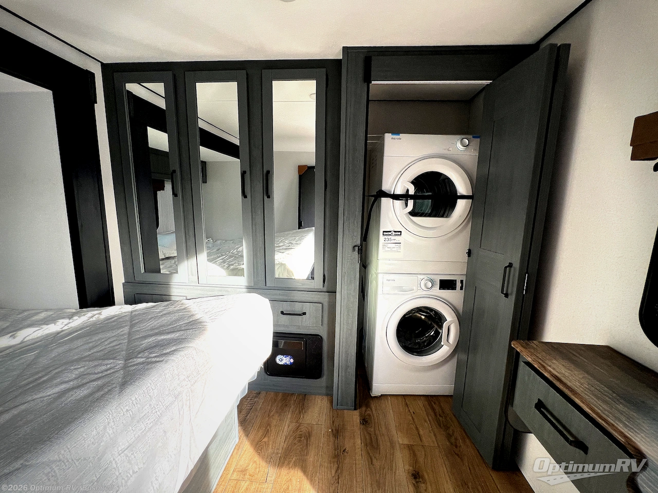 Wherever your destination may be, you can be sure to enjoy it to the fullest with this trailer in tow! With two entry doors, you can enter in through the front private bedroom or the main living area. The bedroom includes a king bed slide out, a desktop if you need to work from home, and a wardrobe/closet to keep your clothes organized. There is also a closet with the washer and dryer prep if you plan to add these appliances. Just outside this room are steps that lead to the large loft area with a 58" x 58" bunk mat and a cabinet on one side, plus two 32" x 80" bunk mats on the other. There is also a front cabinet and a wardrobe/closet for plenty of storage space. Once you've headed back downstairs, you can relax on the theater seating, rear sofa, or table and chairs with bench seating. And the chef of your group will love the kitchen with its residential style refrigerator and pantry, kitchen island, and four burner cooktop!
