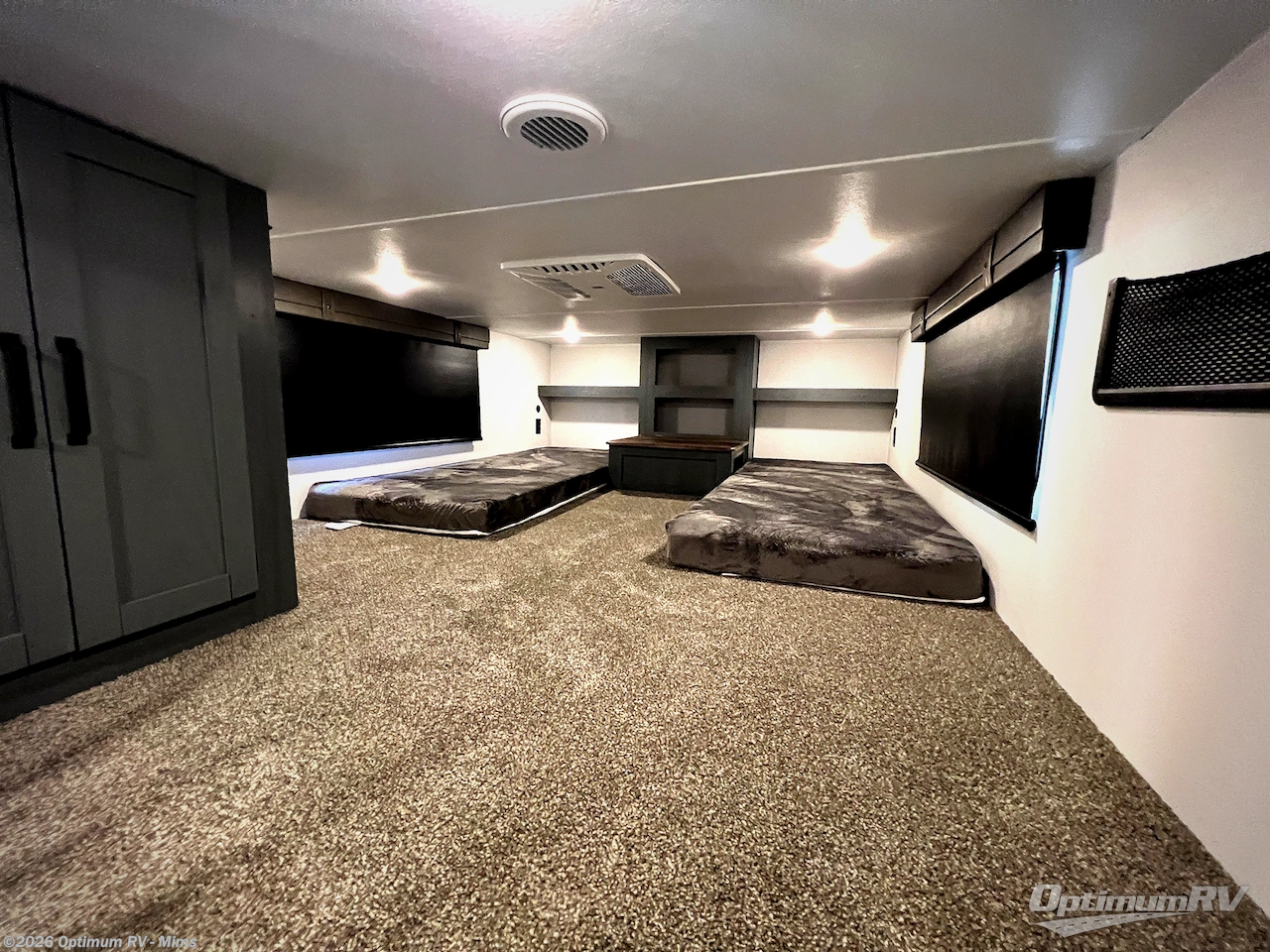 Wherever your destination may be, you can be sure to enjoy it to the fullest with this trailer in tow! With two entry doors, you can enter in through the rear private bedroom or the main living area. The bedroom includes a king bed slide out, a wardrobe/closet to keep your clothes organized, plus a closet with the option to add washer and dryer prep. Just outside this room are steps that lead to the large loft area with a 58" x 58" bunk mat and a cabinet on one side, plus two 32" x 69" bunk mats on the other. There is also a cabinet and a wardrobe/closet for plenty of storage space. Once you've headed back downstairs, you can relax on the dual recliners, front sofa, or free-standing table with a bench and two seats. And the chef of your group will love the kitchen with its residential style refrigerator and pantry, kitchen island, and four burner cooktop!