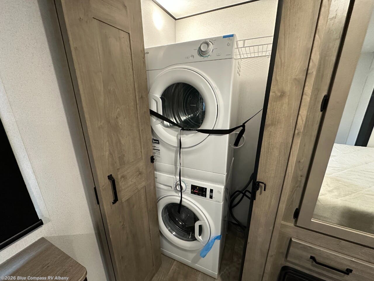 Wherever your destination may be, you can be sure to enjoy it to the fullest with this trailer in tow! With two entry doors, you can enter in through the rear private bedroom or the main living area. The bedroom includes a king bed slide out, a wardrobe/closet to keep your clothes organized, plus a closet with washer and dryer prep. Just outside this room are steps that lead to the large loft area with a 58" x 58" bunk mat and a cabinet on one side, plus two 32" x 69" bunk mats on the other. There is also a cabinet and a wardrobe/closet for plenty of storage space. Once you've headed back downstairs, you can relax on the theater seating, front sofa, or table and chairs with a bench seating. And the chef of your group will love the kitchen with its residential style refrigerator and pantry, kitchen island, and four burner cooktop!