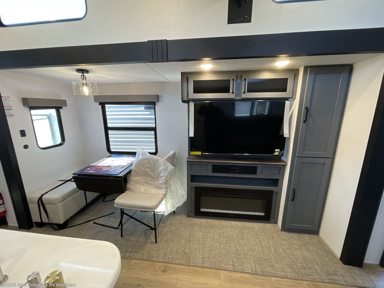 Head to your favorite spots with this destination trailer! With two entry doors, you can easily enter or exit the unit. The front private bedroom includes a king bed slide out, a wardrobe and dresser to keep your clothes organized, plus a countertop for your books or jewelry. Just outside this room is the ladder that leads to the large loft area with two 32" x 80" bunk mats, a cubby, a counter, a nightstand, and cabinets. Once you've headed back downstairs, you can relax on the L-shaped sofa across from the entertainment center with a fireplace and slide-out cabinet or the table and chairs with bench seating. And the chef of your group will love the kitchen with its residential style refrigerator and pantry, kitchen island, and four burner cooktop. The full rear bathroom not only has a 32" x 40" shower with a seat to freshen up in, and a closet with washer/dryer prep, but is also below the second loft with a 32" x 80" bunk mat and closet for storage!