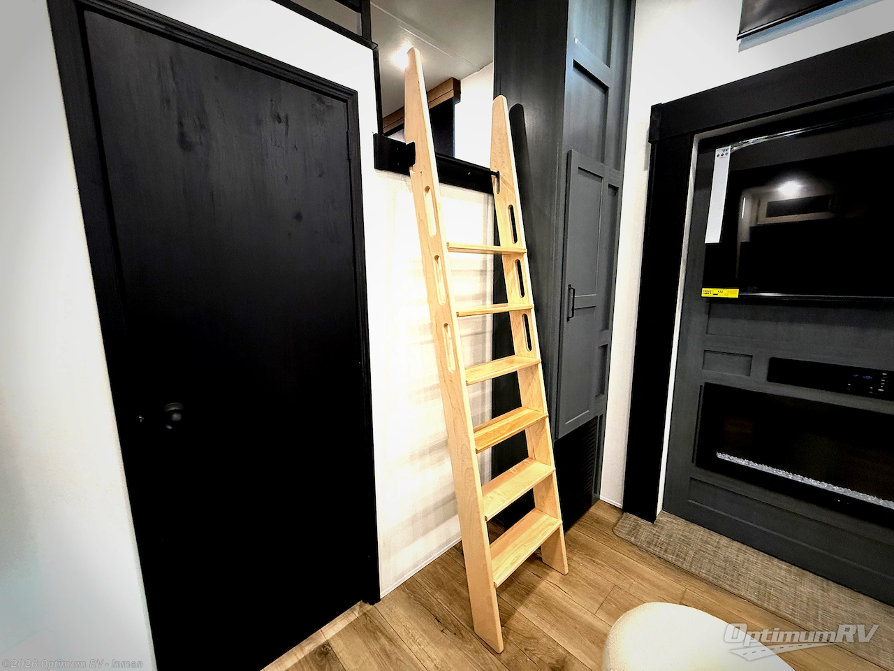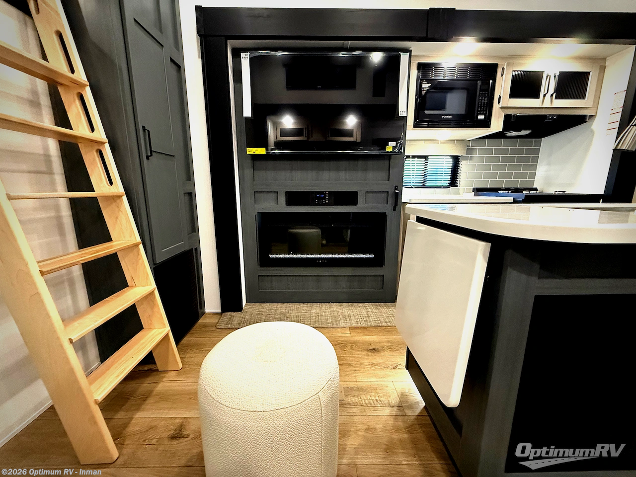 You won't believe the amount of comfort found in this destination trailer! There are two separate loft areas; one up front with a ladder, two bunk mats, storage space, and an optional fireplace, and one in the back with a ladder, two bunk mats, storage space, and a nightstand! On the main level, you'll find your own space in the front private bedroom, complete with a king bed slide, a countertop, dresser, and even washer and dryer prep. And a full bath is right next to the bedroom for easy nighttime use. Head to the full kitchen where you'll find all the appliances to cook meals, a kitchen island with an extension for more prep space, plus two pantries, one being hidden behind the TV! The comfort continues on in the rear master bedroom, complete with a queen bed slide, a desk with a chair, and a wardrobe for clothes. And the second full bath is found in the very back for added convenience!