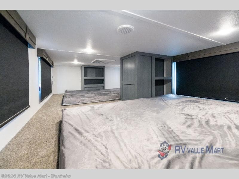 Your crew of eight will love extended stays in this spacious destination trailer. With dual opposing slides in the combined kitchen and living area, everyone can relax comfortably on the L-shaped sofa with recliners at the end or dine at the table and chairs. There is a spacious kitchen island with two chairs, a pantry for dry goods, and even a second, hidden pantry behind the TV for games, movies and more. A full bath is located right as you enter the unit for added convenience, and you'll find the second full bath up front in the master bedroom. You're sure to enjoy the king bed slide out here, along with a dresser and a wardrobe/closet to keep your things tidy. There is even washer and dryer prep in the front bath if you choose to add these appliances. Your guests or little ones will love the loft that includes two 54" x 74" bunk mats and storage on one side, plus a third bunk mat (32" x 74") and storage on the other!