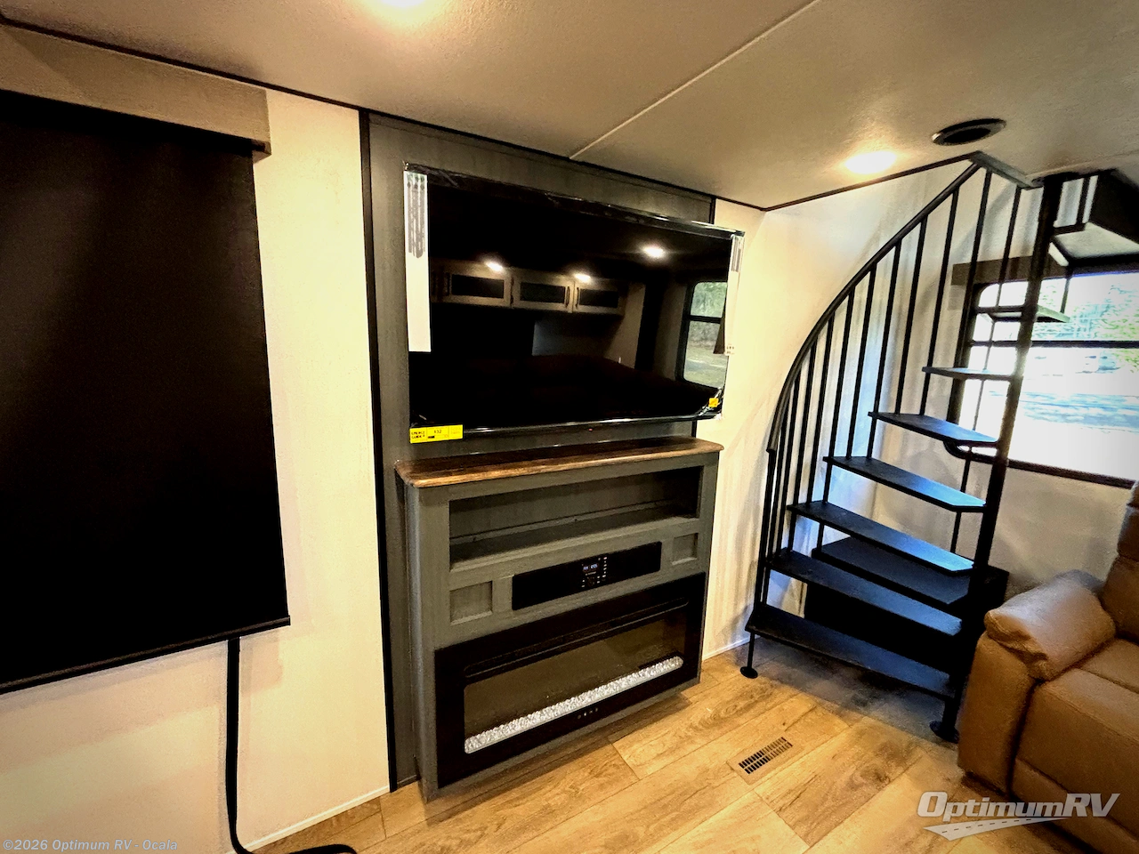 You won't believe the amount of comfort found in this destination trailer! There are two separate loft areas; one up front with a ladder, two bunk mats, a nightstand, cabinet, and bookshelf storage, and one in the back with steps, two bunk mats and a cabinet for storage! On the main level, you'll find your own space in the front private bedroom, complete with a king bed slide, a countertop, dresser, and even washer and dryer prep. And the full bath is right next to the bedroom for easy nighttime use. Head to the full kitchen to make meals on the four-burner stove, store food in the pantry and residential-style refrigerator and dine at the large kitchen island with four chairs. The rear living area will be a favorite hangout spot with its L-shaped sofa with recliners and an ottoman, along with an entertainment center with a smart TV and fireplace!