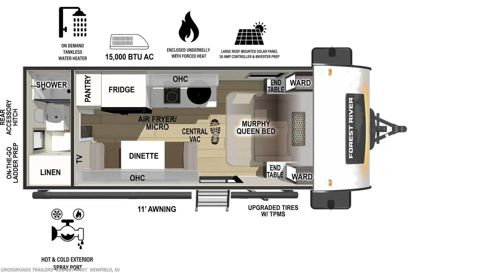 This travel trailer features a well-thought-out floorplan suited for efficient living and travel. While specific dimensions such as length and height are not provided, this RV's compact design allows for easy towing and maneuverability. Its exterior design is crafted to withstand the elements while offering a sleek and modern aesthetic that stands out on the road. Inside, the trailer is designed to comfortably sleep multiple travelers, ensuring cozy nights after your days of adventure.