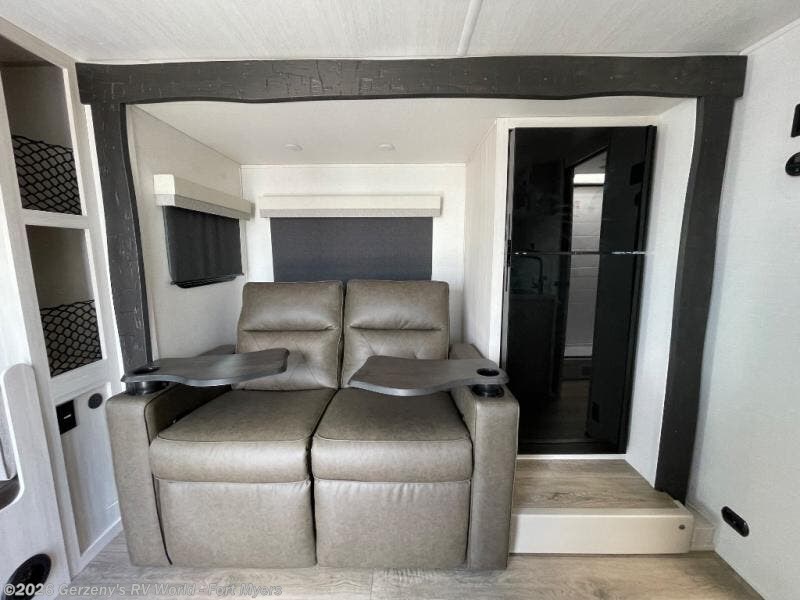 Whether you spend your days at the lake or in the woods, you'll be met with comfort in this spacious travel trailer. There is a rear dinette where you can enjoy your meals together, a 56" theater seat across from a 12V TV, and a slide out for added space. The walk-through bath includes a night light for easy nighttime use, and the front master bedroom includes a queen bed just like at home. There are also dual wardrobes and end tables plus an entertainment center if you want to add a TV. Outside, you'll find a rear accessory hitch, upgraded tires with TPMS, a 14' awning, and a slam latch cargo doors to keep your gear secure.