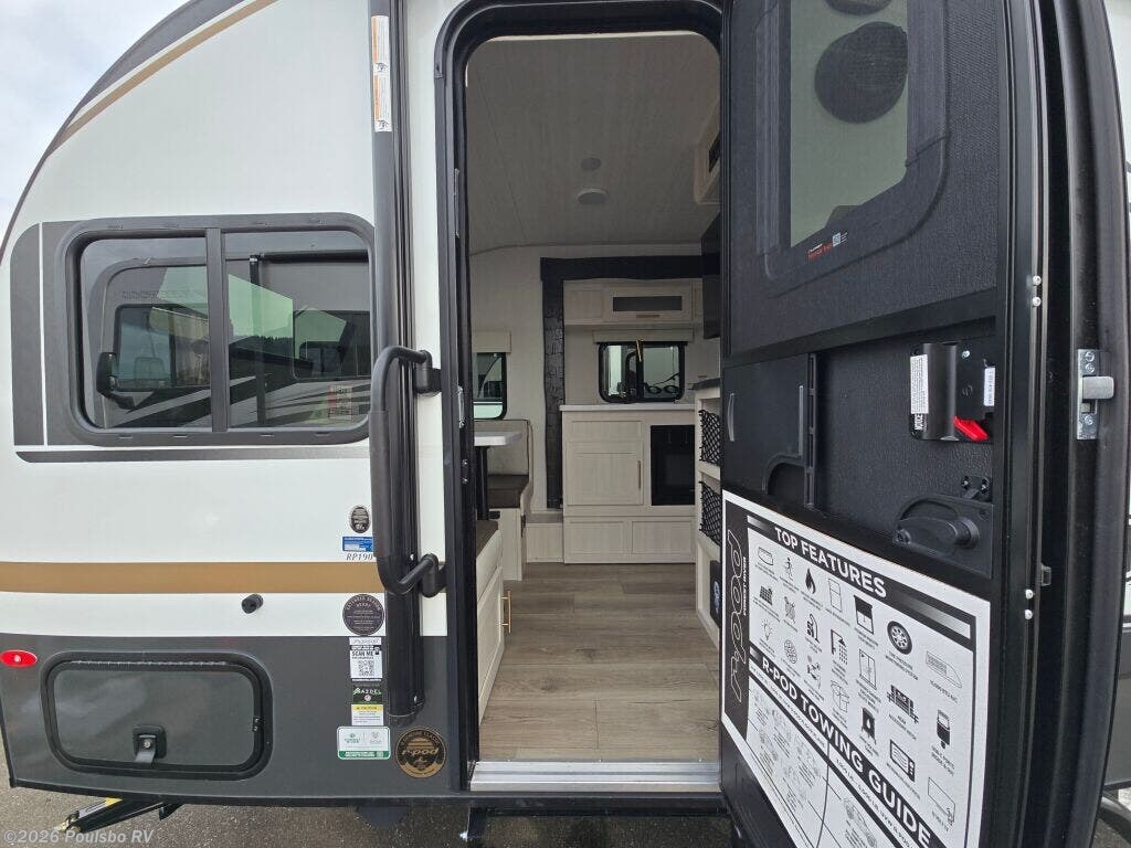 The 2026 Forest River R-Pod RP-190 is a compact and efficient travel trailer designed to provide comfort and flexibility for your RV adventures. Measuring just over 20 feet in length, this new model offers an ideal size for easy towing while still delivering a practical living space. It comfortably accommodates up to 4 people, making it great for small families or couples who want extra sleeping arrangements. Inside, the well-designed layout maximizes space, creating a cozy environment to relax and enjoy your travels. A single slide-out expands the main living area, giving more room for gathering and increasing comfort. The included awning enhances outdoor living with shade and protection for outside activities. This trailer features a bathroom with 30-gallon black and gray water tanks to support extended stays without frequent waste stops. With a gross vehicle weight rating of 4770 pounds and a dry weight of 3049 pounds, towing is balanced and stable, supported by a hitch weight of 370 pounds. Additional conveniences like leveling jacks make setup quick and easy at any campsite. As a new Forest River model, the R-Pod combines quality, durability, and user-friendly design, making it a strong choice for those new to RVing or anyone seeking a practical and nimble RV. Whether exploring campgrounds or off-the-beaten-path locations, this travel trailer delivers essential features and a comfortable space for your journeys. As a family-owned, award-winning local RV dealer with multiple locations in Sumner, Everett, Kent, and Mt Vernon Washington, Poulsbo RV here to help you find the perfect RV. Stock#: M3813, VIN: 5ZT2RPHC7TV028146