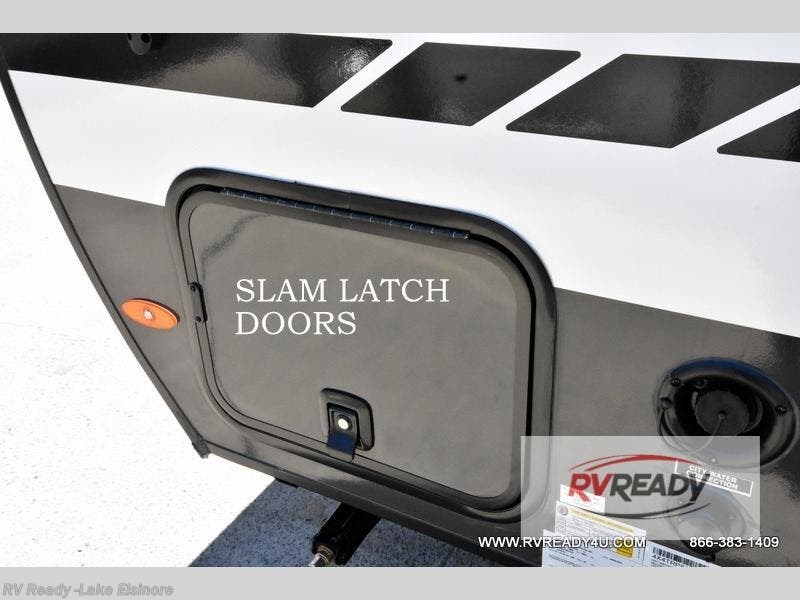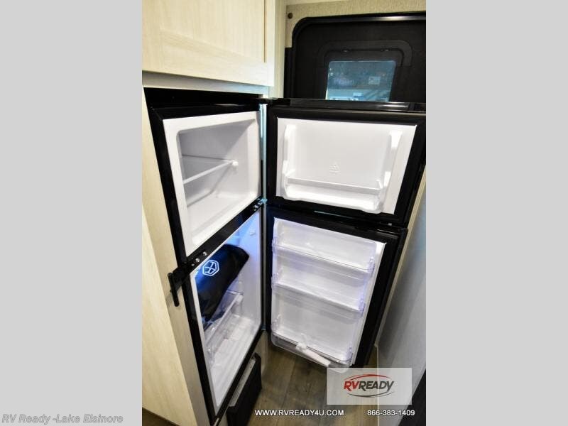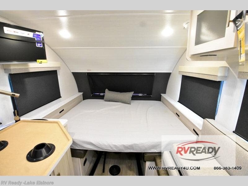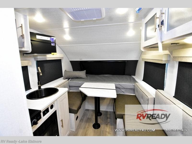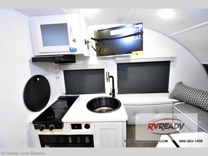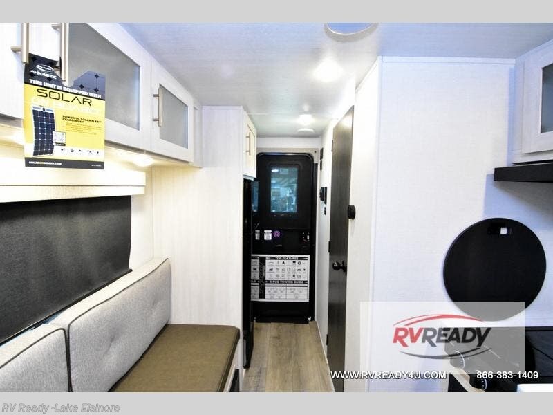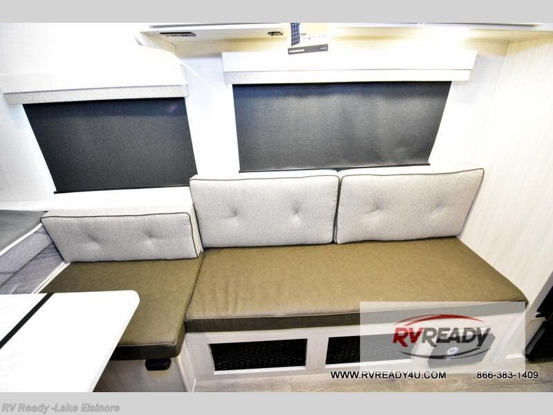 Weekends at the lake just got sweeter in this cozy travel trailer. You can prepare your meals each day on the two burner cooktop, or in the convection microwave. There is a sofa to relax on with a good book, plus a booth dinette up front that features a Murphy bed you can fold down at night. This model also includes a 12V black glass refrigerator to keep your perishables fresh, and a pantry to store snacks and dry goods.