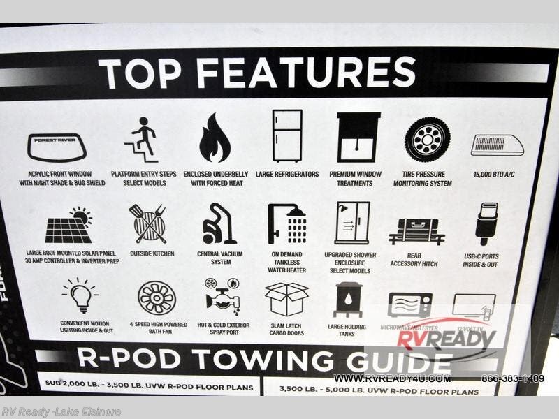 With any R-Pod travel trailer by Forest River, you will enjoy affordable luxury at the lowest tow weight in its class! There is a sealed underbelly with forced heat, a curved dual-pane acrylic front window with a bug screen and night shade, plus a large roof mounted solar panel for off-grid capabilities. The 15K A/C unit will keep you comfortable during the summer camping months, and the tankless water heater will provide endless hot showers after hiking, biking, swimming and more! Each model also includes a black glass friction hinge entrance door, roof ladder prep, exterior motion lighting, plus a hot and cold exterior spray port to wash off sand from the beach. Inside, you'll enjoy seamless Surf-X kitchen countertops, blackout roller shades, and a central vacuum system for hassle-free cleaning!
