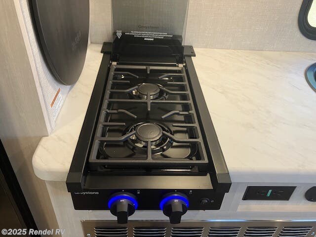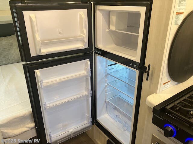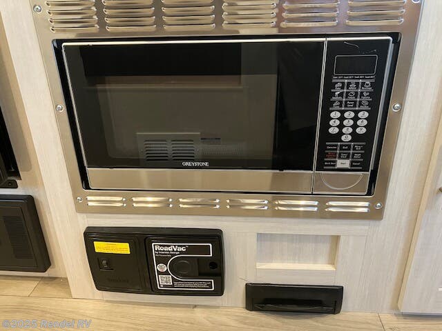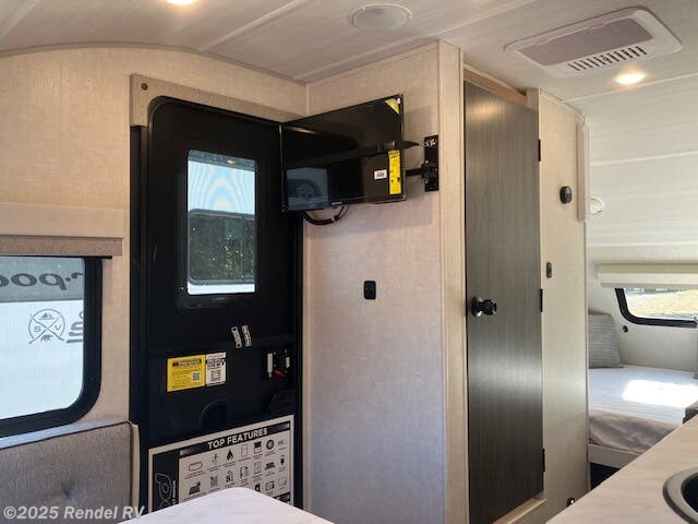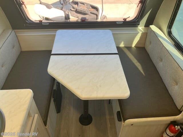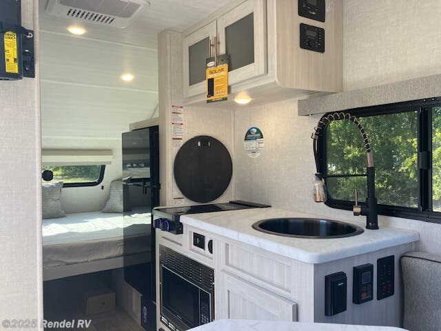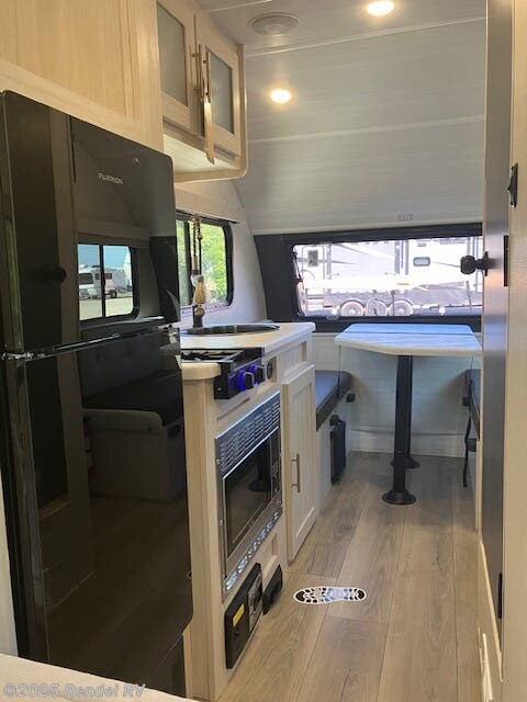 The R-Pod's smart layout offers a cozy environment equipped with essential amenities. The rear bedroom features a queen bed for restful nights, while the convertible booth dinette provides additional sleeping space, making it perfect for small families or couples. Inside, you'll find a microwave, oven, stove top burner, and refrigerator to satisfy your culinary needs. Skylights and air conditioning ensure natural light and a comfortable climate regardless of the weather. For ease of cleaning, a central vacuum system is included, enhancing your living experience.