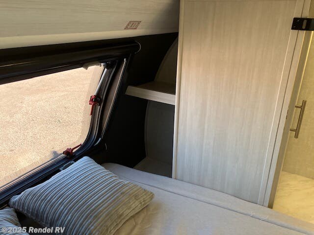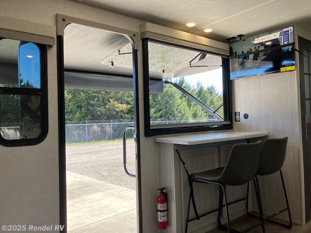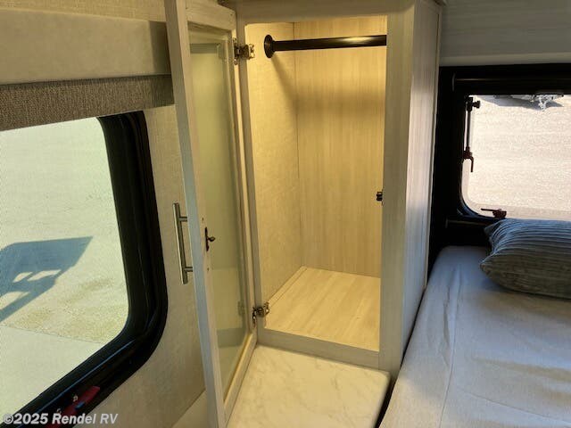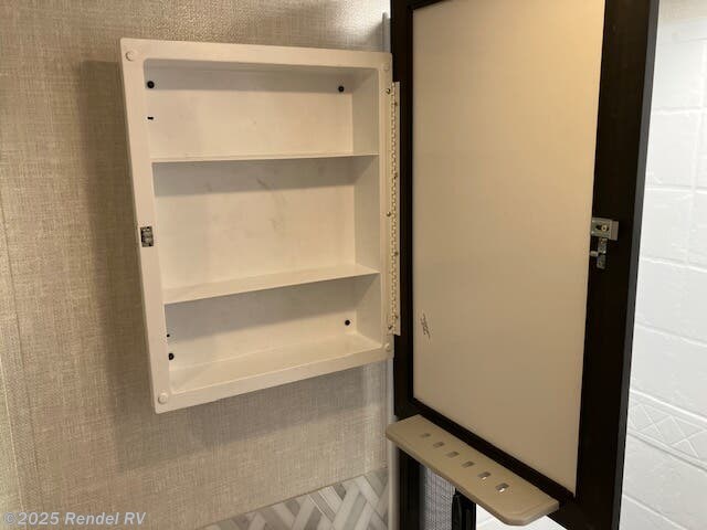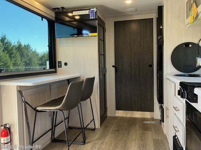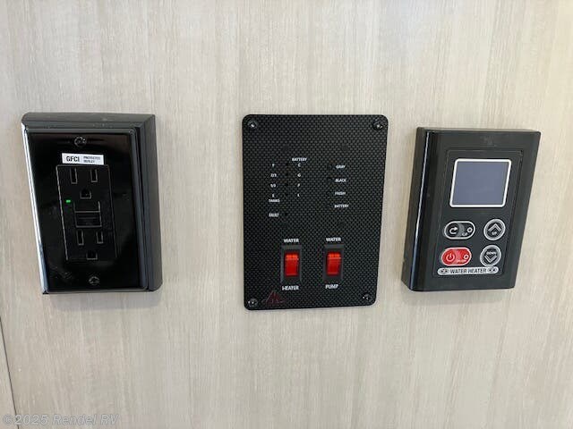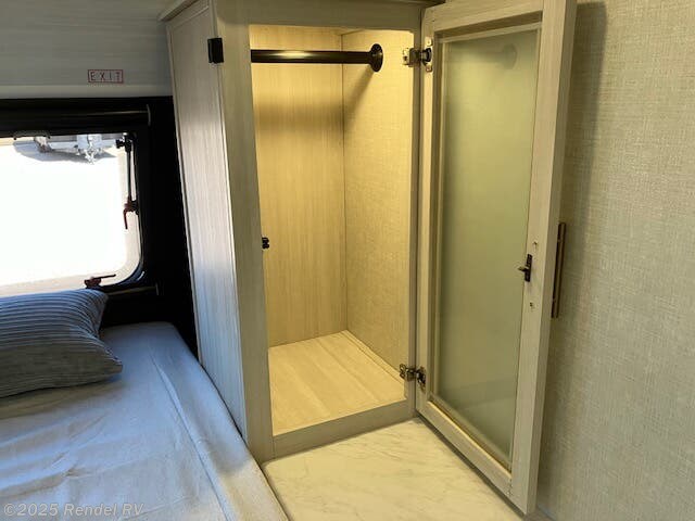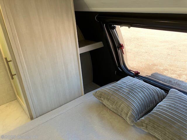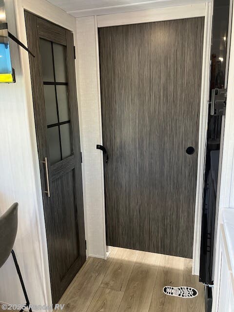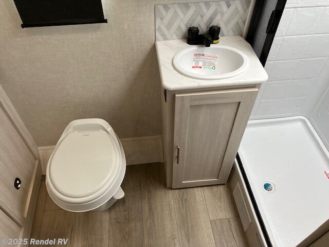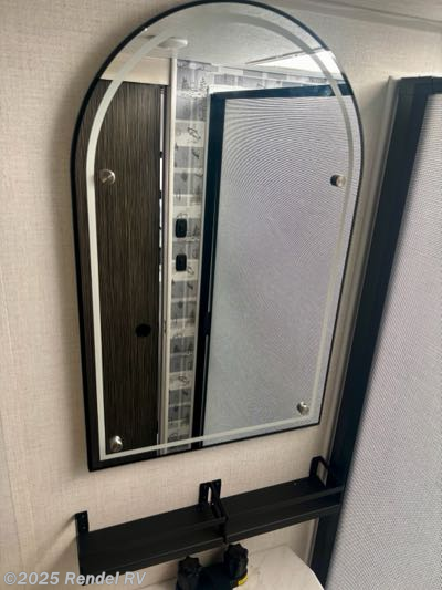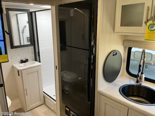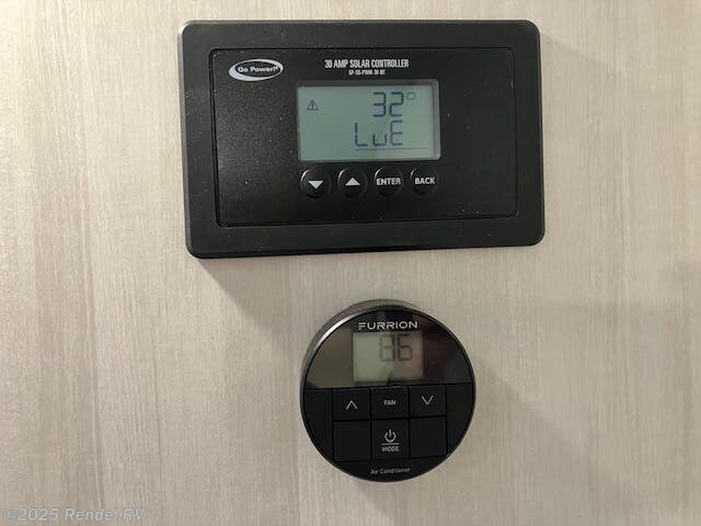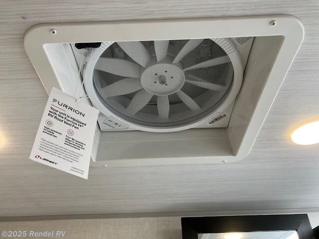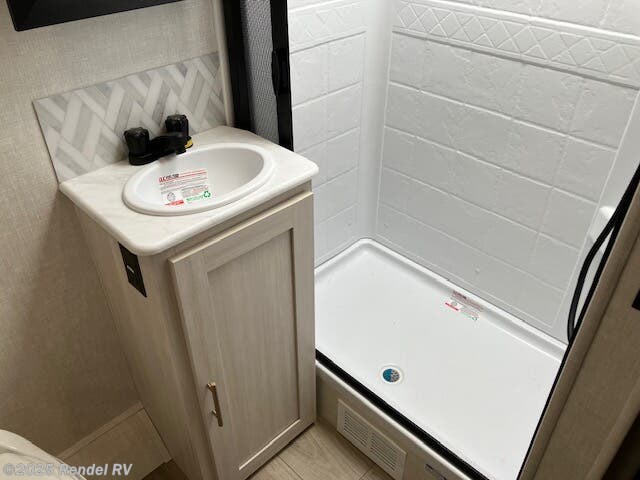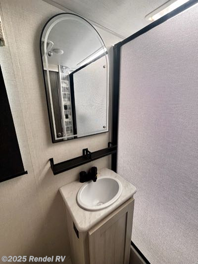 The bathroom occupies the entire rear of this RV, featuring a walk-in shower, spacious linen cabinets, and a powerful Furrion Bath Fan. Enjoy on-demand hot water with the Tankless Water Heater, allowing you to maintain comfort during all your adventures.