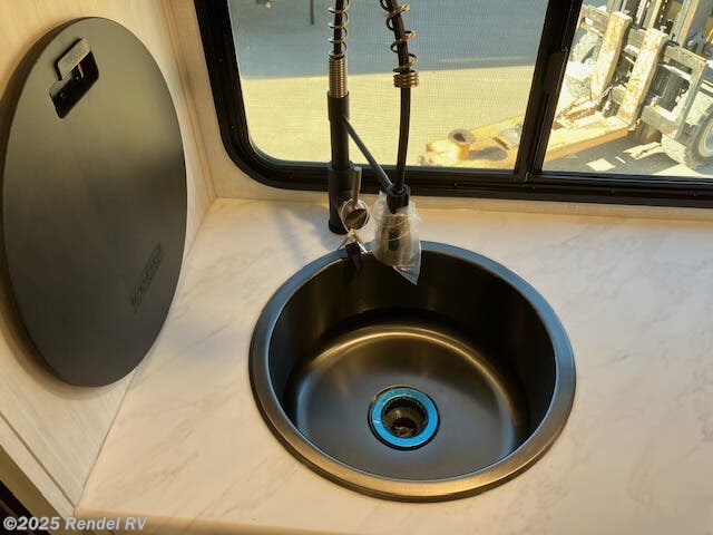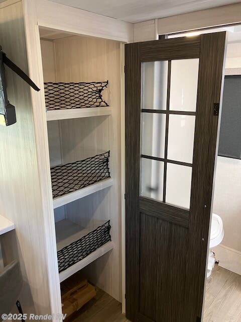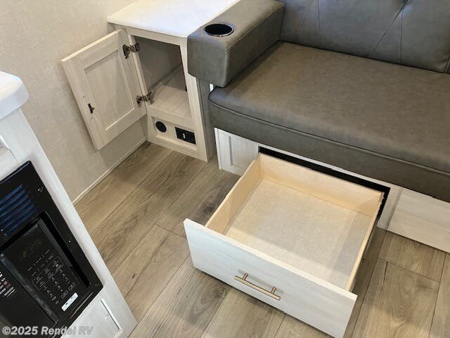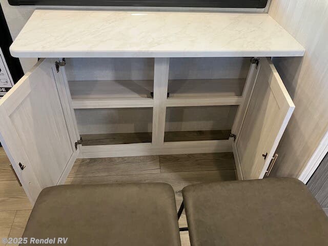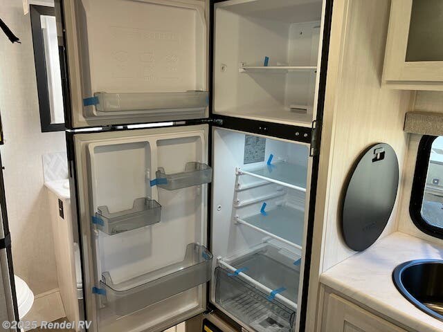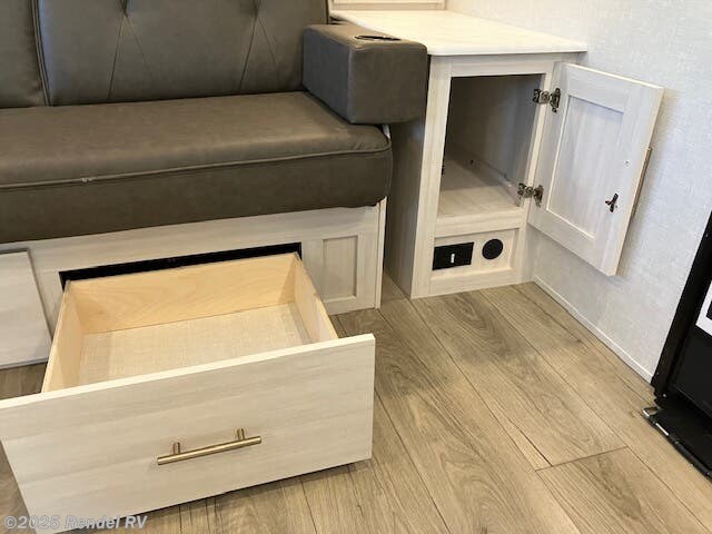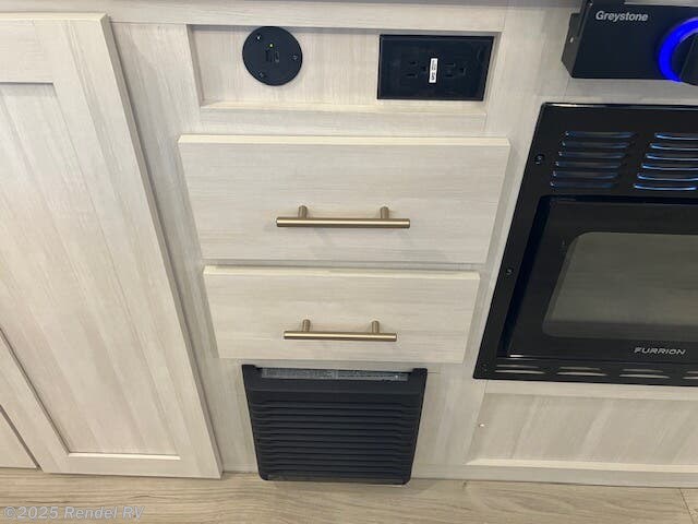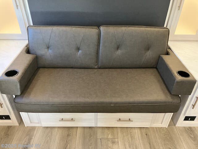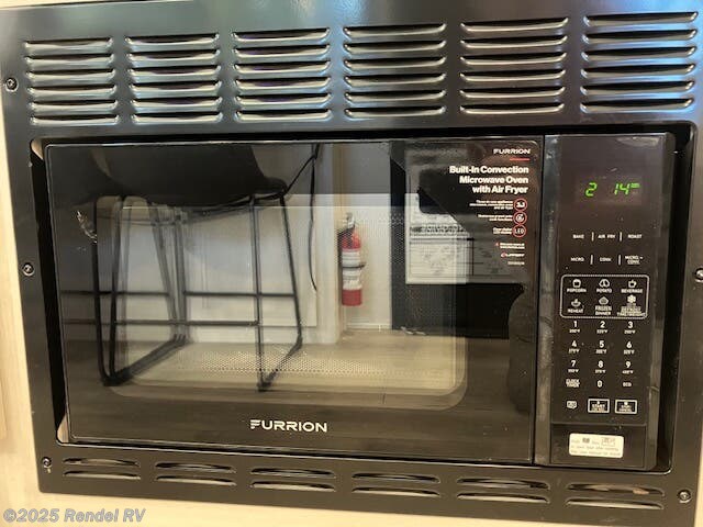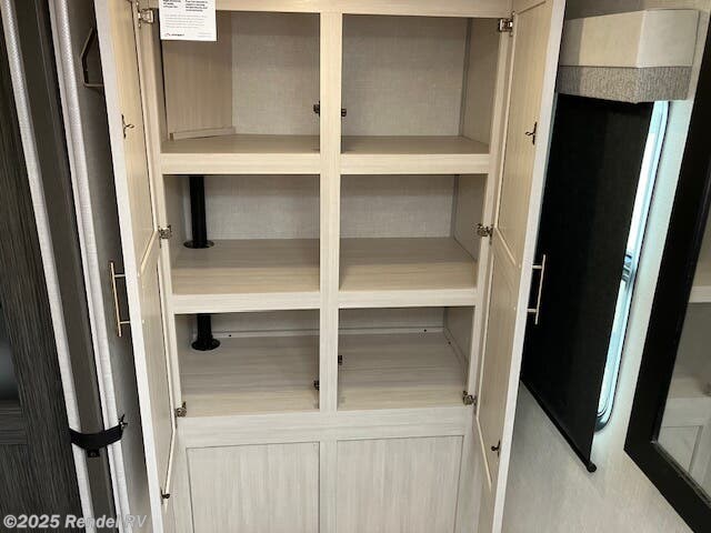 Fulfilling all your culinary needs, the kitchen boasts a huge 12V glass front refrigerator and a generously sized pantry equipped with netting to securely hold your groceries. Plus, get creative with the Convection Microwave/Air Fryer and spacious deep dish bowl sink!
