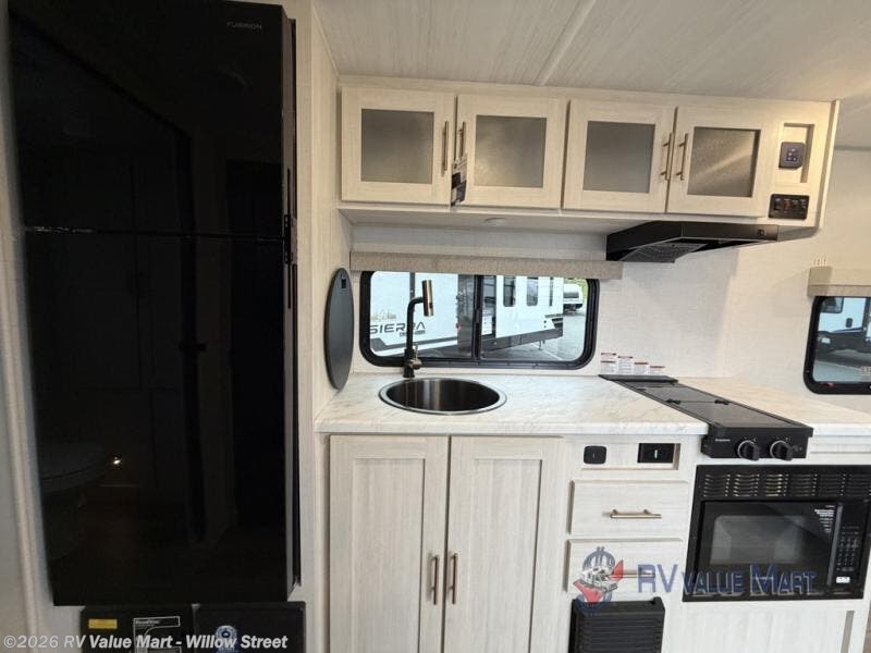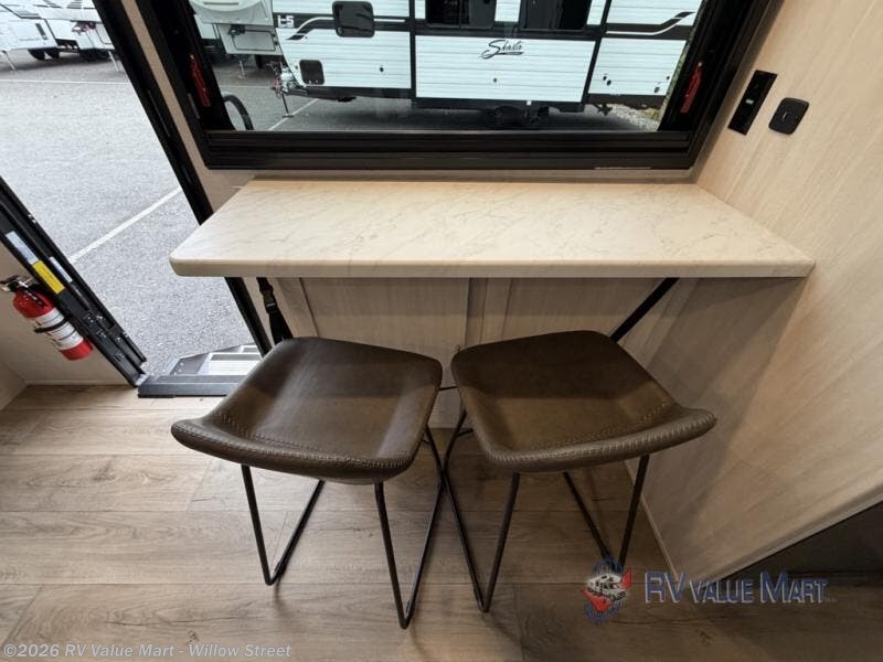 This versatile travel trailer is perfect for two adventure-seeking campers! You will love having a queen-size Murphy bed up front since you can fold it away during the day and relax on the sofa. There are also dual wardrobes to keep your clothes out of the way plus dual end end tables to set your coffee or book on. A full kitchen includes a convection microwave, 12V black glass refrigerator, and a counter with two chairs where you can dine each day. You will also love the flip-up window above the table, along with a 12V TV to keep you entertained, plus a pantry to keep food stocked. Head to the full rear bath that includes a large linen closet, a shower, and a night light for added convenience. The exterior is just as accommodating with its large roof mounted solar panel, rear accessory hitch, slam latch cargo doors, and more!