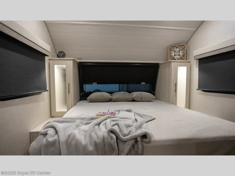 Whether you spend your days at the lake or in the woods, you'll be met with comfort in this spacious travel trailer. There is a rear dinette where you can enjoy your meals together, a 56" theater seat across from a 12V TV, and a slide out for added space. The walk-through bath includes a night light for easy nighttime use, and the front master bedroom includes a queen bed just like at home. There are also dual wardrobes and end tables plus an entertainment center if you want to add a TV. Outside, you'll find a rear accessory hitch, upgraded tires with TPMS, a 14' awning, and a slam latch cargo doors to keep your gear secure.