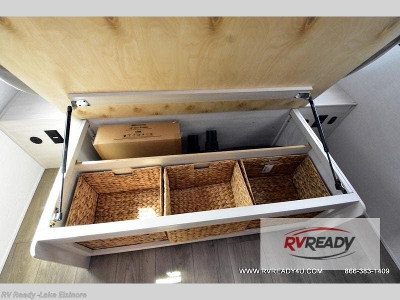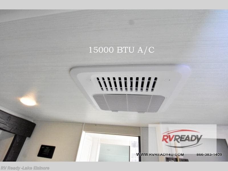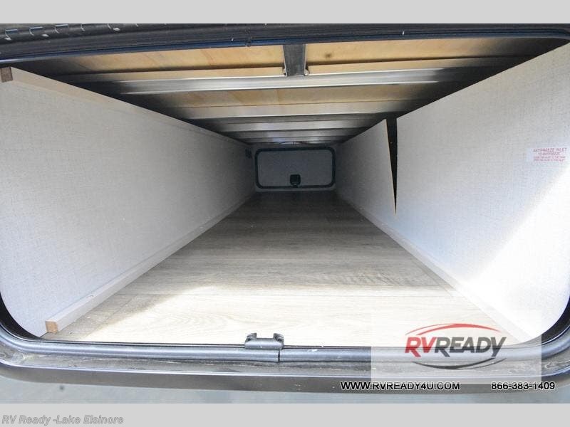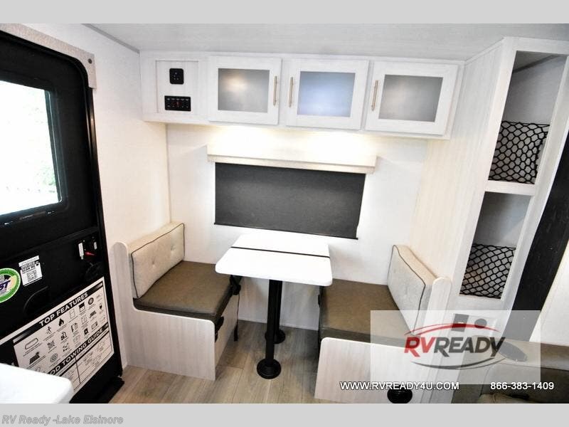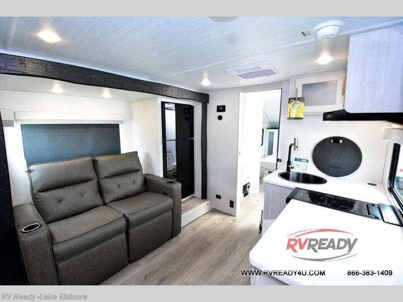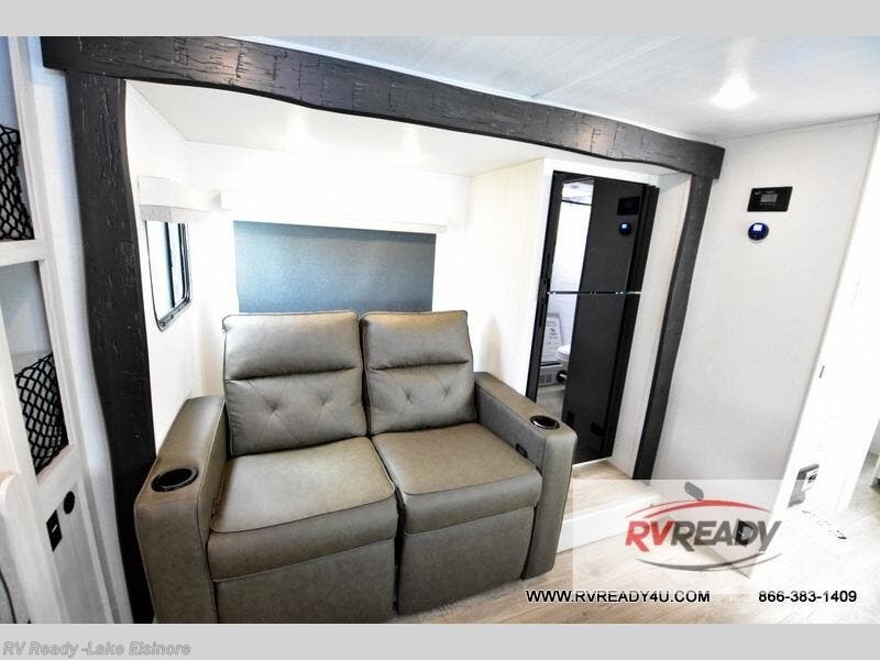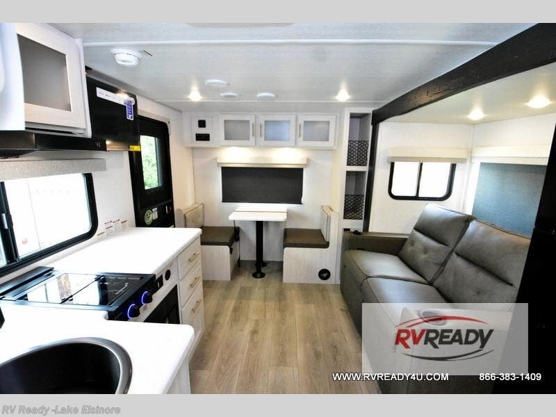 Whether you spend your days at the lake or in the woods, you'll be met with comfort in this spacious travel trailer. There is a rear dinette where you can enjoy your meals together, a 56" theater seat across from a 12V TV, and a slide out for added space. The walk-through bath includes a night light for easy nighttime use, and the front master bedroom includes a queen bed just like at home. There are also dual wardrobes and end tables plus an entertainment center if you want to add a TV. Outside, you'll find a rear accessory hitch, upgraded tires with TPMS, a 14' awning, and a slam latch cargo doors to keep your gear secure.