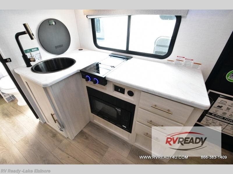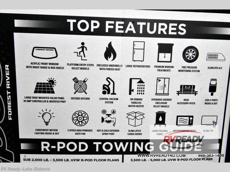 With any R-Pod travel trailer by Forest River, you will enjoy affordable luxury at the lowest tow weight in its class! There is a sealed underbelly with forced heat, a curved dual-pane acrylic front window with a bug screen and night shade, plus a large roof mounted solar panel for off-grid capabilities. The 15K A/C unit will keep you comfortable during the summer camping months, and the tankless water heater will provide endless hot showers after hiking, biking, swimming and more! Each model also includes a black glass friction hinge entrance door, roof ladder prep, exterior motion lighting, plus a hot and cold exterior spray port to wash off sand from the beach. Inside, you'll enjoy seamless Surf-X kitchen countertops, blackout roller shades, and a central vacuum system for hassle-free cleaning!