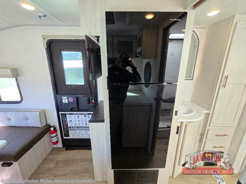 Time spent in this travel trailer will be time well spent! You will have all the comforts of home, including a private bedroom with two wardrobes, a queen bed, and a desk/dresser that will allow you to get some work done if needed. The front U-shaped dinette with a swivel dinette table will double as dining and sleeping space, and the walk-through bath will be easily accessible for everyone to use. You can prepare meals on the two burner cooktop, or use the convection microwave. There is also a 12V black glass 12V refrigerator for food storage and plenty of counter space to prep meals.
