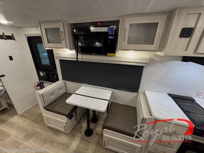 The booth dinette provides a place to enjoy meals, play games, and converts into extra sleeping space when needed.