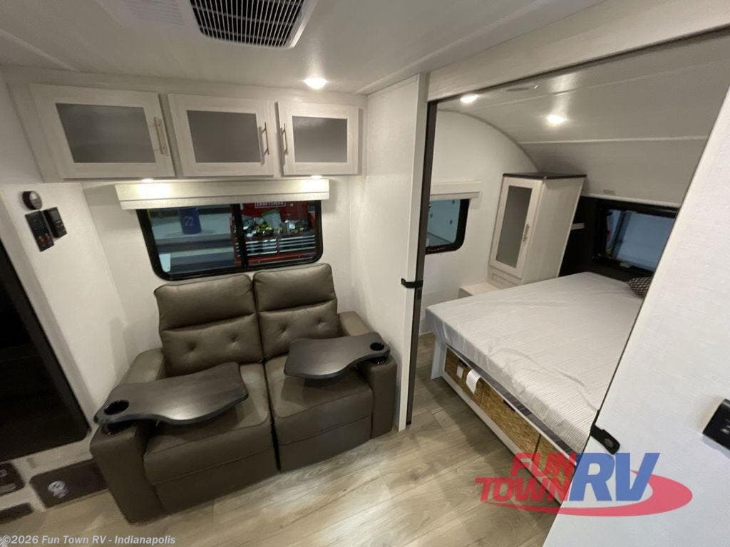 A private bedroom with a walk-around queen bed, a full bath, and sleeping space for guests are a few of the features that you are sure to want in your next RV! You can rest comfortably each night, plus all your clothing can be stored in the dual wardrobes to keep everything tidy. The chef of your group can make meals on the two burner cooktop or in the convection microwave, and there is a 12V black glass refrigerator for perishables. You can relax on the theater seat each evening, and if you're needing additional sleeping space, just choose the optional tri-fold sofa!