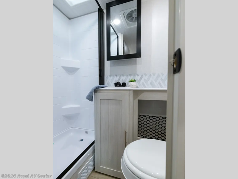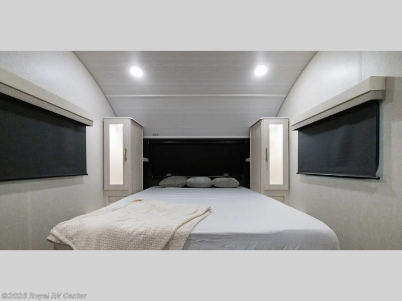 A front bedroom with a walk-around queen bed, a full bath, and a theater seat slide out are a few of the features that you are sure to want in your next RV! You can rest comfortably each night, plus all your clothing can be stored in the dual wardrobes to keep everything tidy. If you're needing more sleeping space, just choose the optional tri-fold sofa or optional booth dinette in place of the theater seat! The chef of your group can make meals on the two burner cooktop or in the convection microwave, and there is a 12V black glass refrigerator for perishables. And the bar top with two seats and the flip-up window provide a great view outdoors as you dine together.