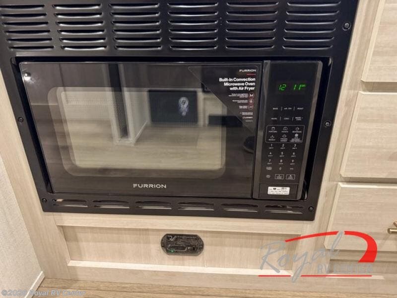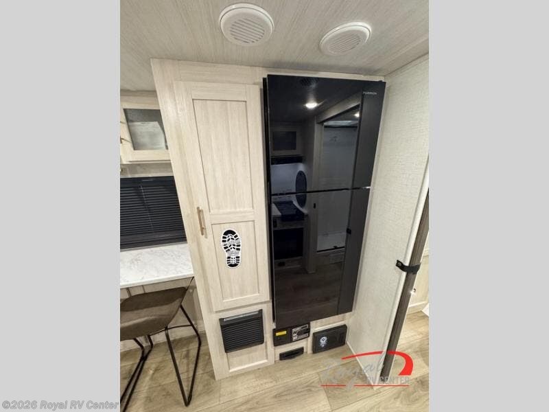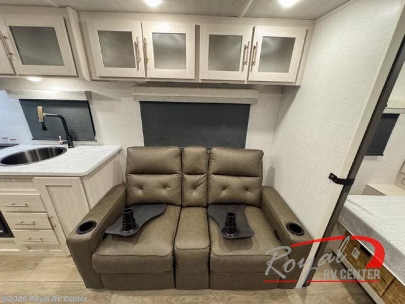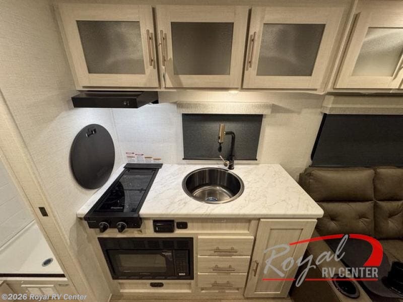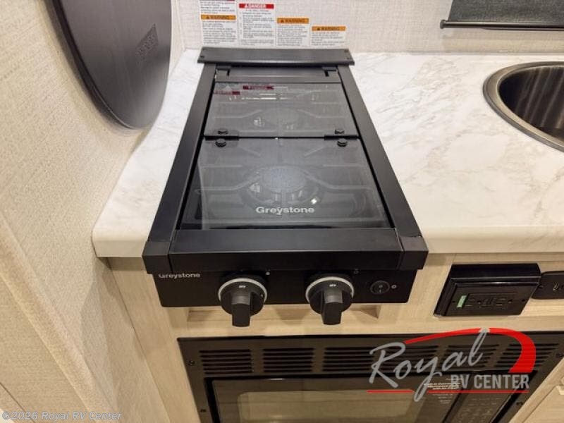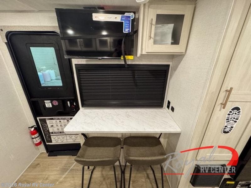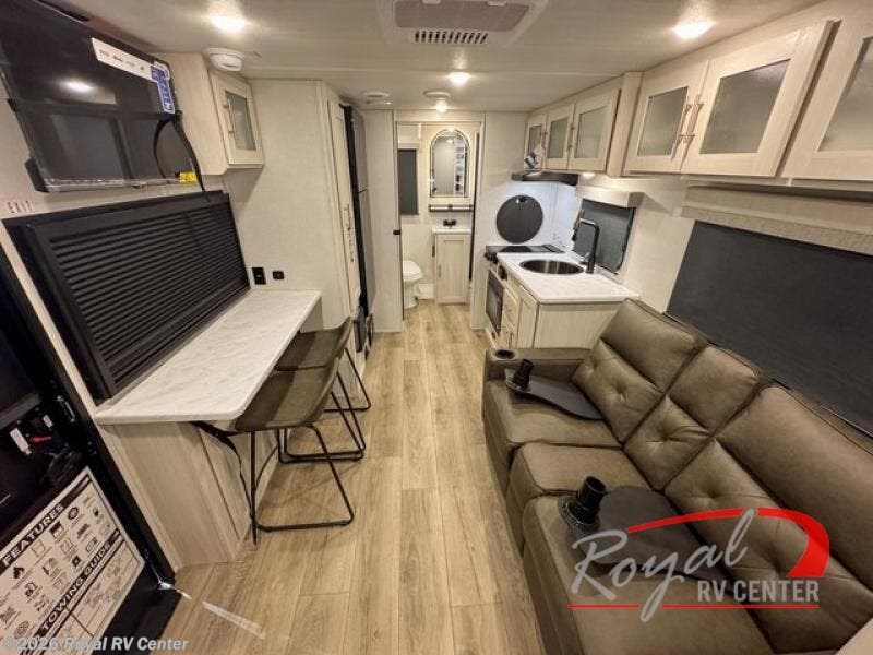 A front private bedroom with a walk-around queen bed, a full rear bath, and a theater seat are a few of the features that you are sure to want in your next RV! You can rest comfortably each night, plus all your clothing can be stored in the dual wardrobes to keep everything tidy. If you're needing more sleeping space, just choose the optional tri-fold sofa in place of the theater seat! The chef of your group can make meals on the two burner cooktop or in the air fryer/microwave, and there is a refrigerator for perishables. And the bar top with two seats and the flip-up window provide a great view outdoors as you dine together.