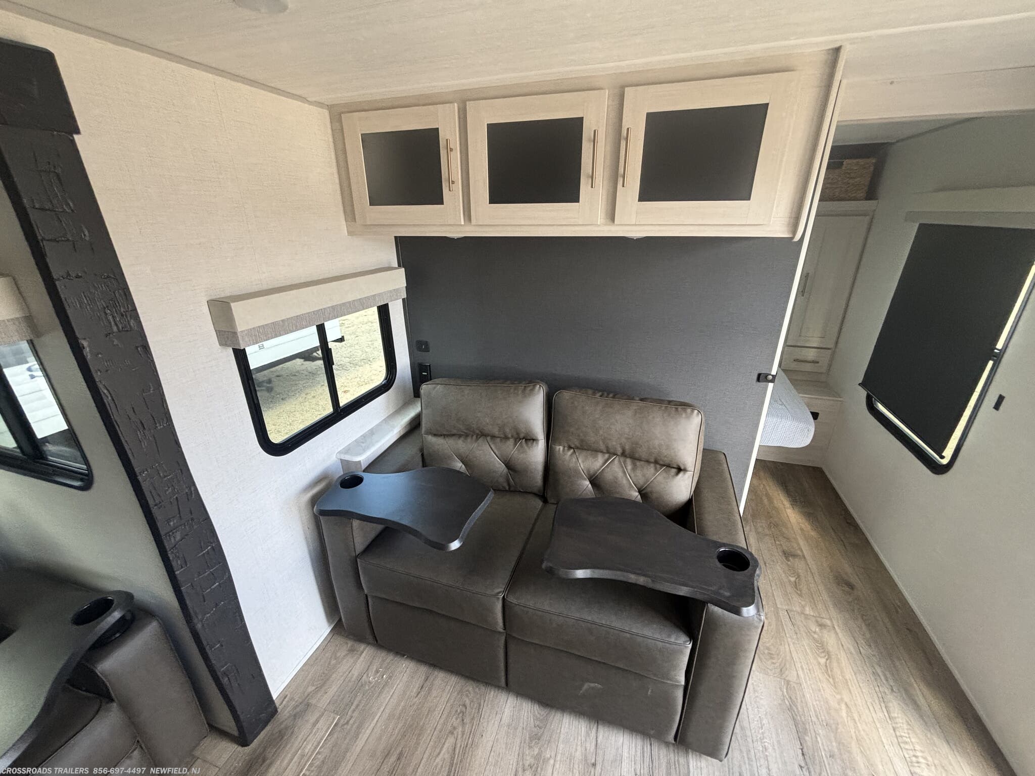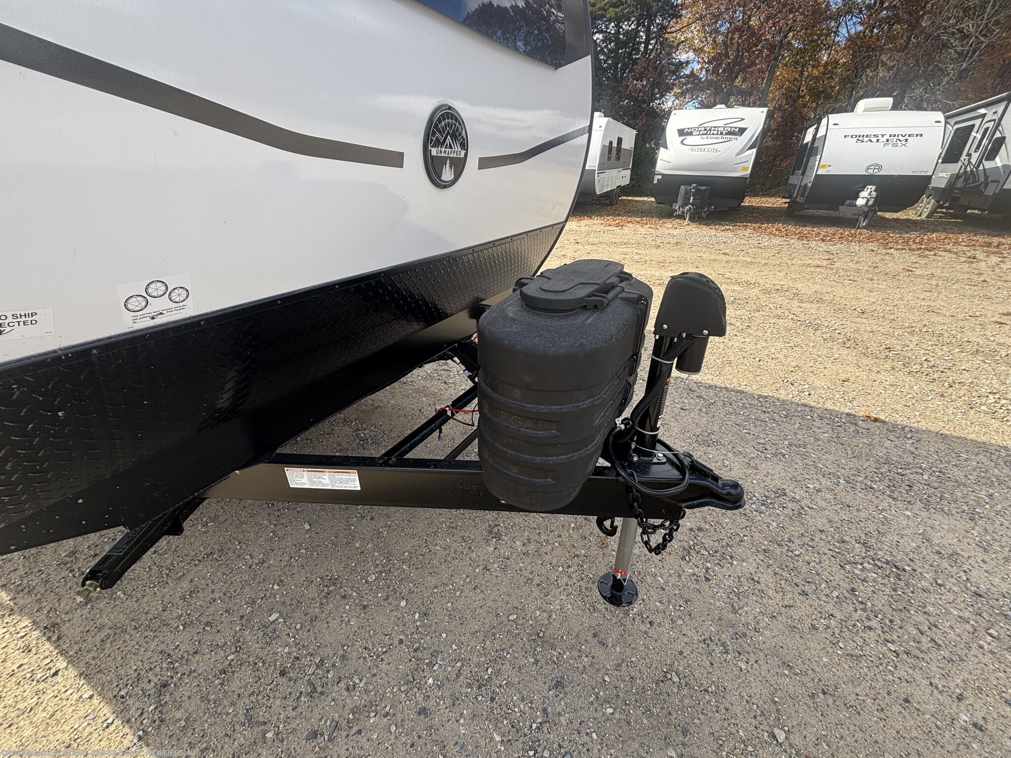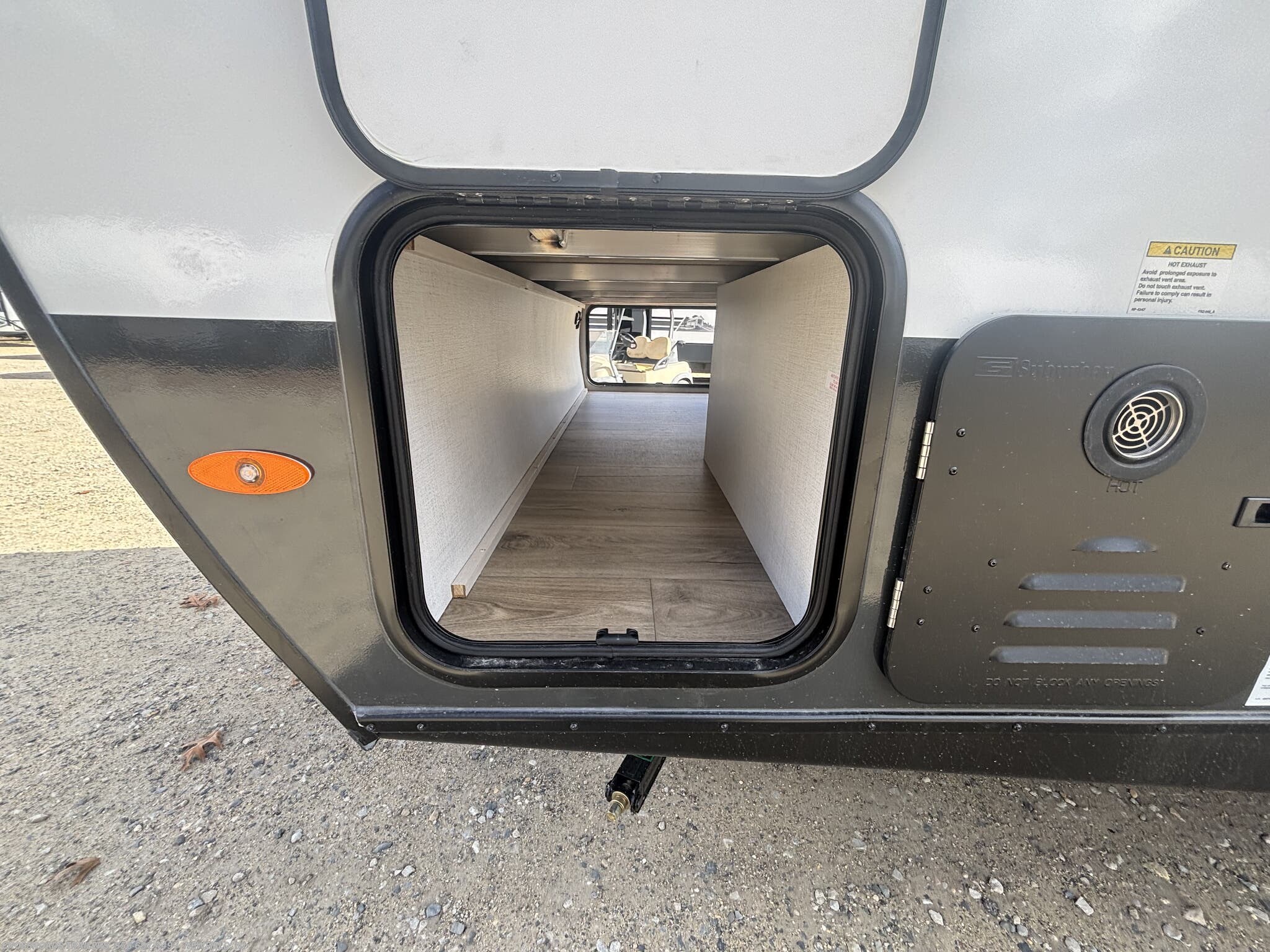 Outdoor features enhance convenience: a powered awning creates a shaded lounge area, while a sturdy ladder, slam-latch baggage doors, and a single entry door simplify daily use on the road. Water systems include 40 gallons each for fresh and grey water and 30 gallons for black water, ensuring practical weekend trips. This model sleeps two, making it a superb basecamp for romantic getaways or festival adventures, with a bumper-pull hitch for straightforward towing and easy maintenance.