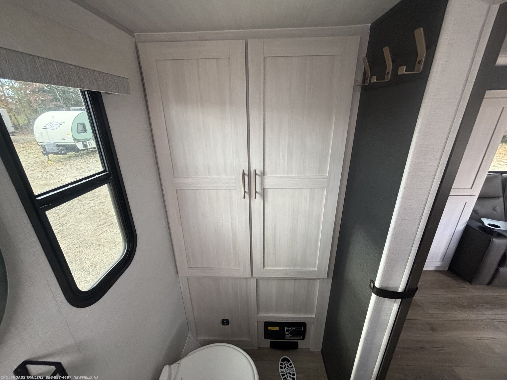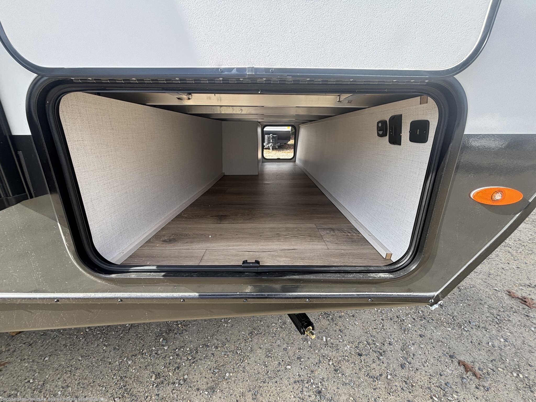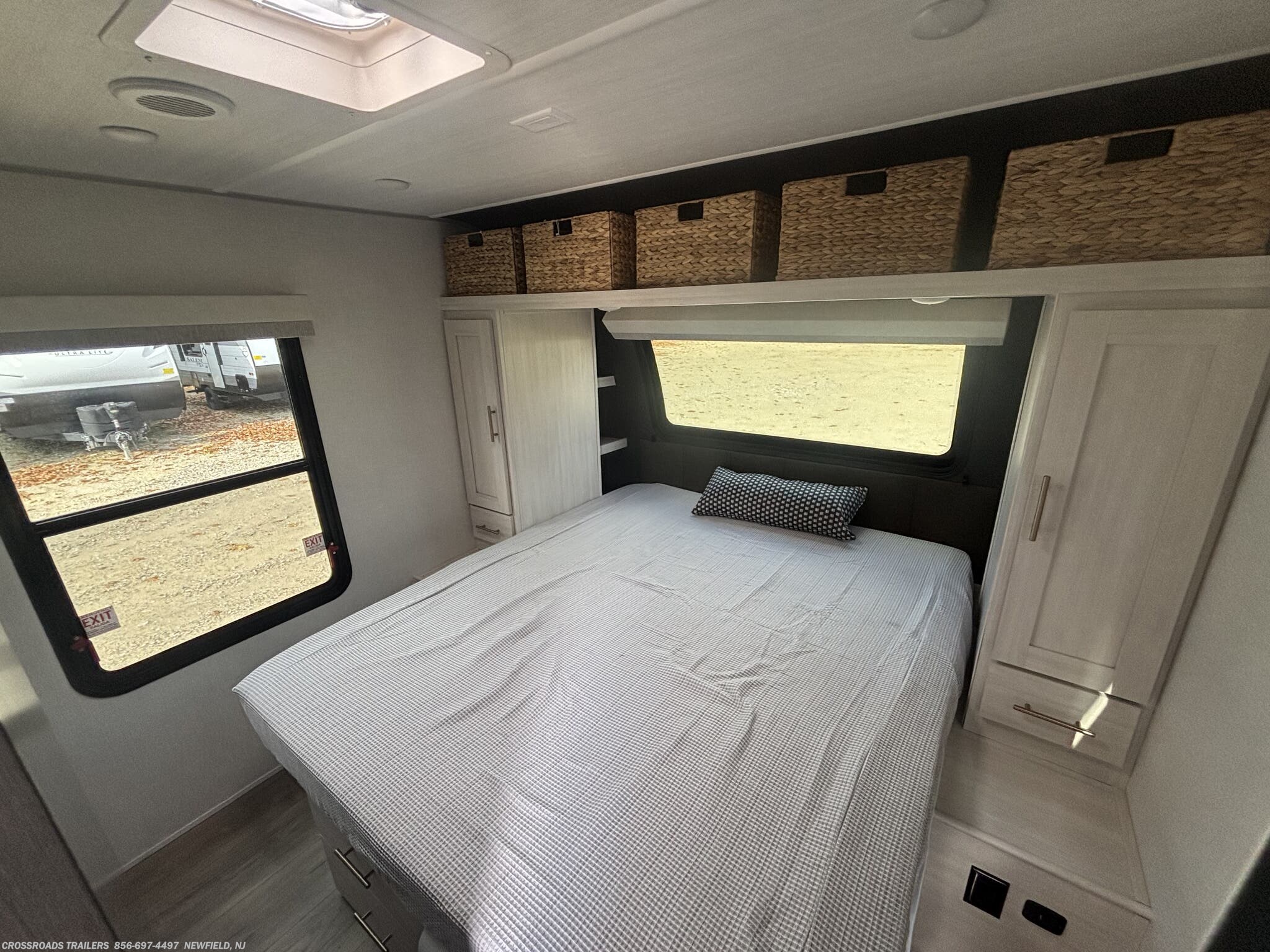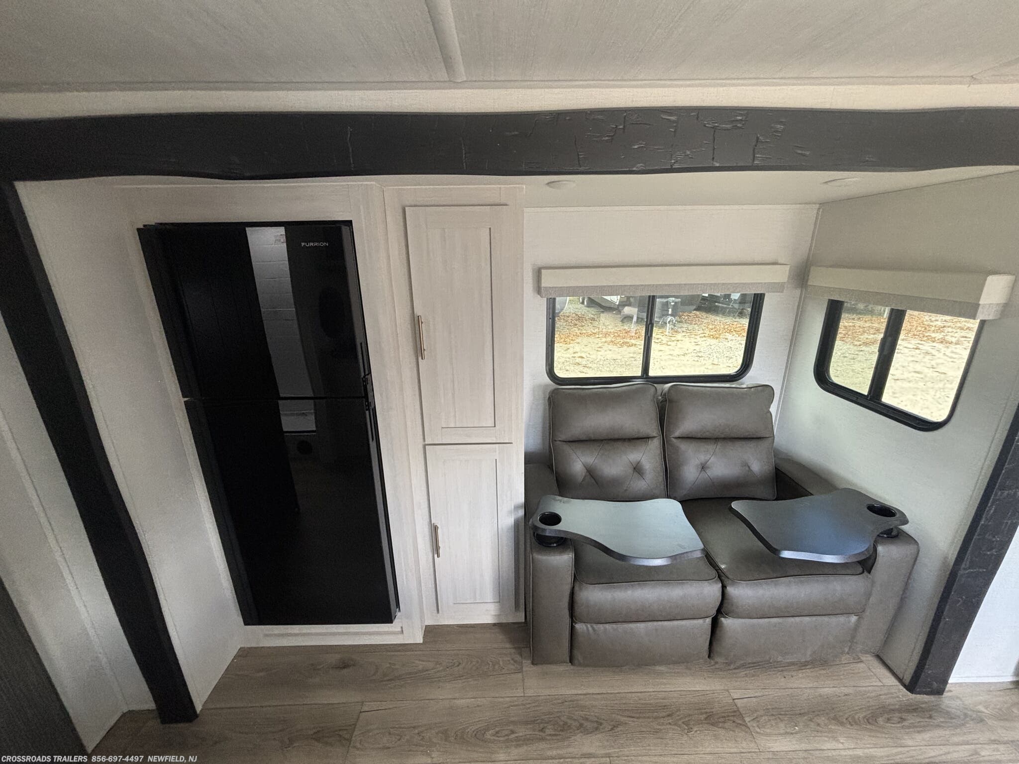 Outdoor features enhance convenience: a powered awning creates a shaded lounge area, while a sturdy ladder, slam-latch baggage doors, and a single entry door simplify daily use on the road. Water systems include 40 gallons each for fresh and grey water and 30 gallons for black water, ensuring practical weekend trips. This model sleeps two, making it a superb basecamp for romantic getaways or festival adventures, with a bumper-pull hitch for straightforward towing and easy maintenance.