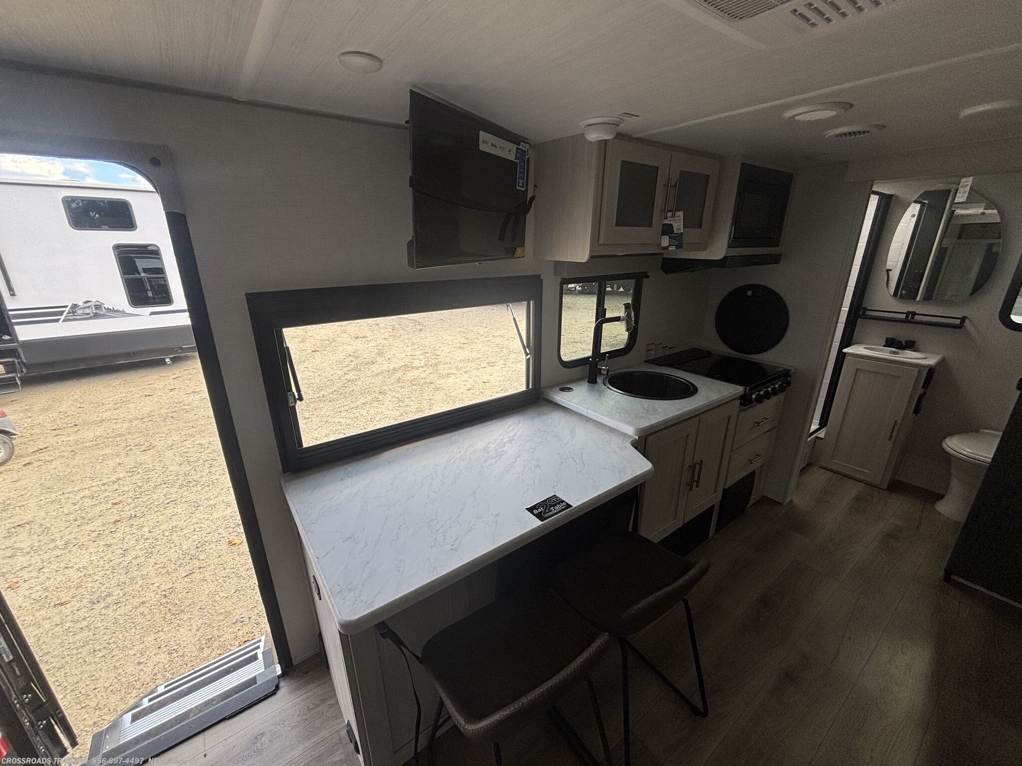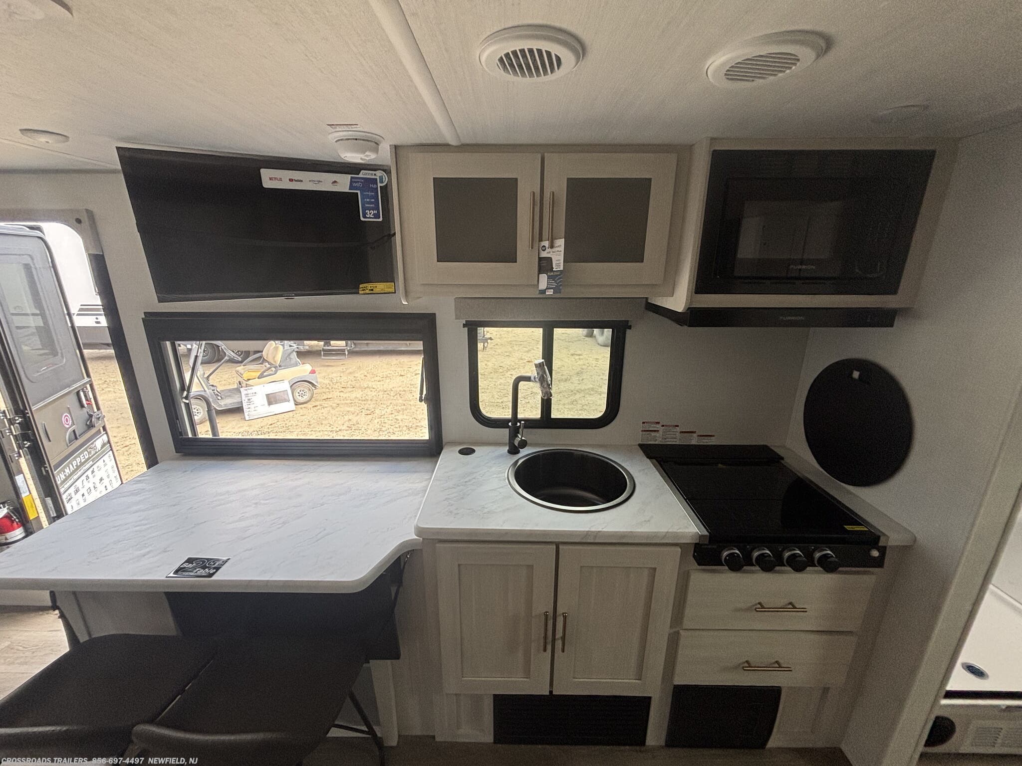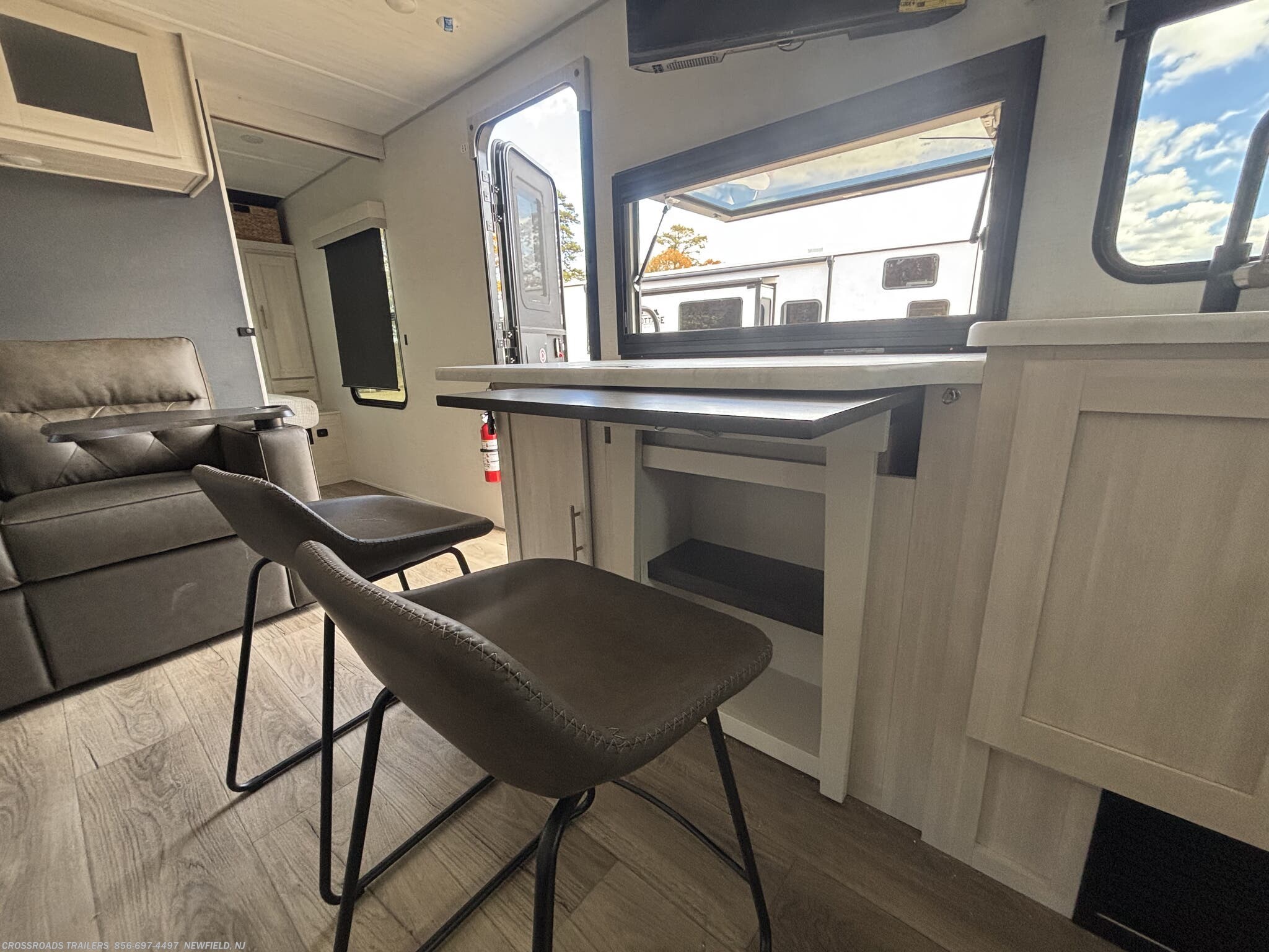Inside, you’ll find a thoughtful flow that moves from a welcoming front bedroom to a functional mid kitchen, through a cozy mid living area, and into a private rear bath. A single slide-out widens the living space for mealtimes and lounging, while a dinette provides space for meals, work, or game nights. Equipped with a microwave, refrigerator, water heater, and an energy-friendly inverter, the trailer supports comfortable off-grid weekends. A 15,000 BTU air conditioner keeps temperatures comfortable, and the unit is prepped for a second A/C if you want peak cooling.