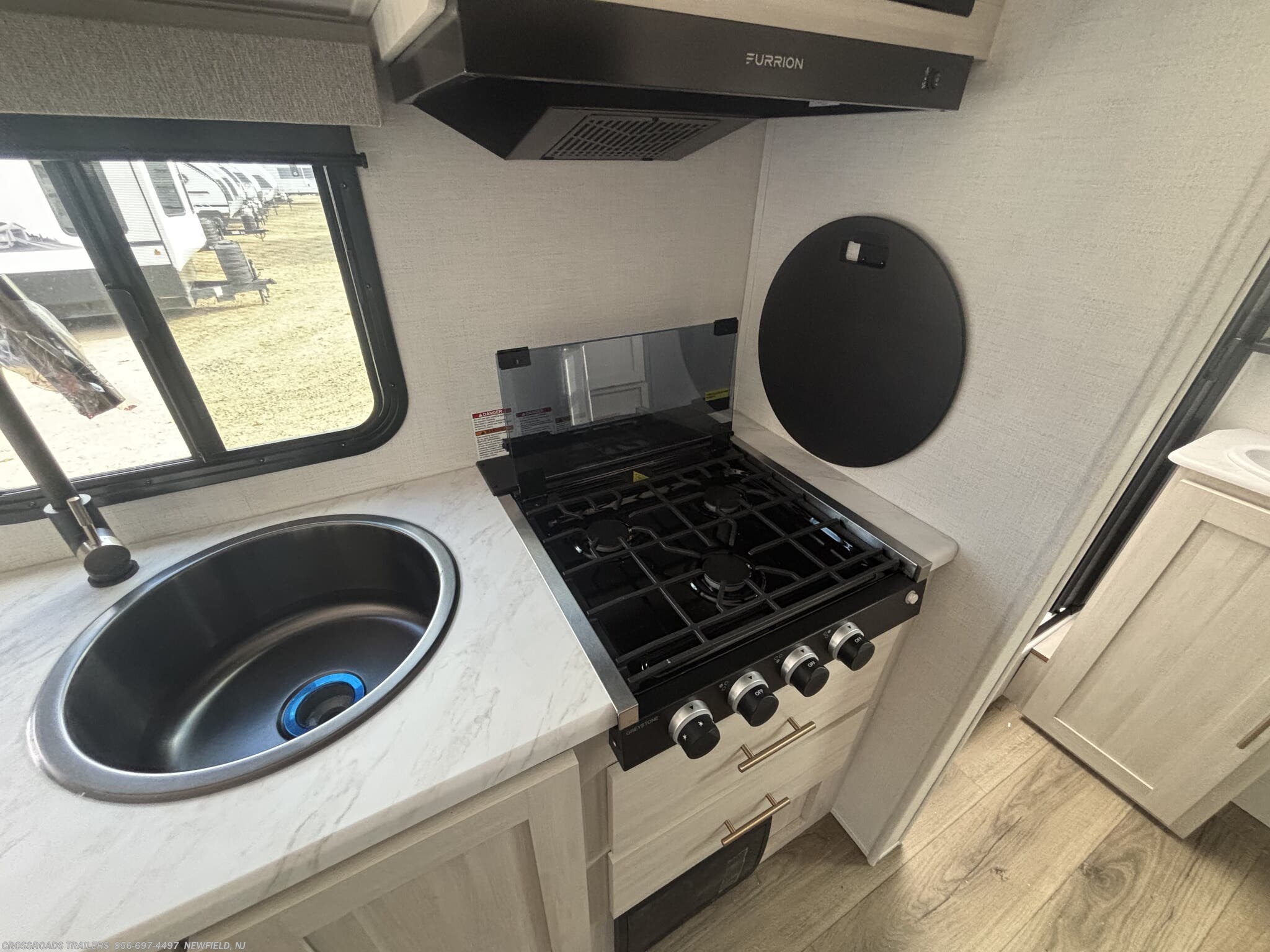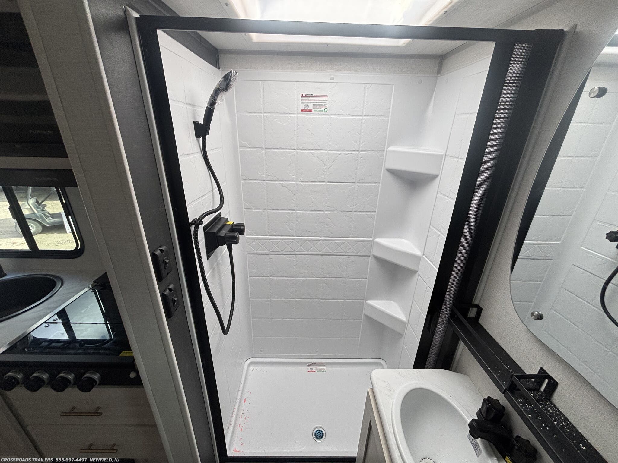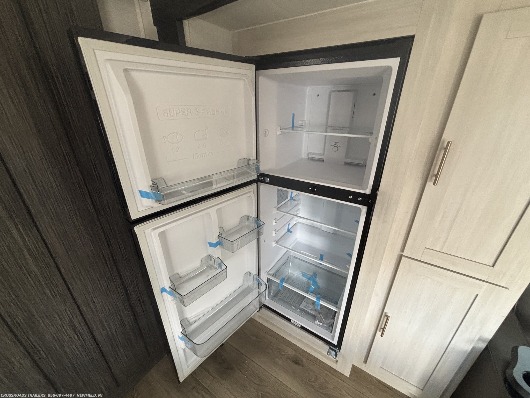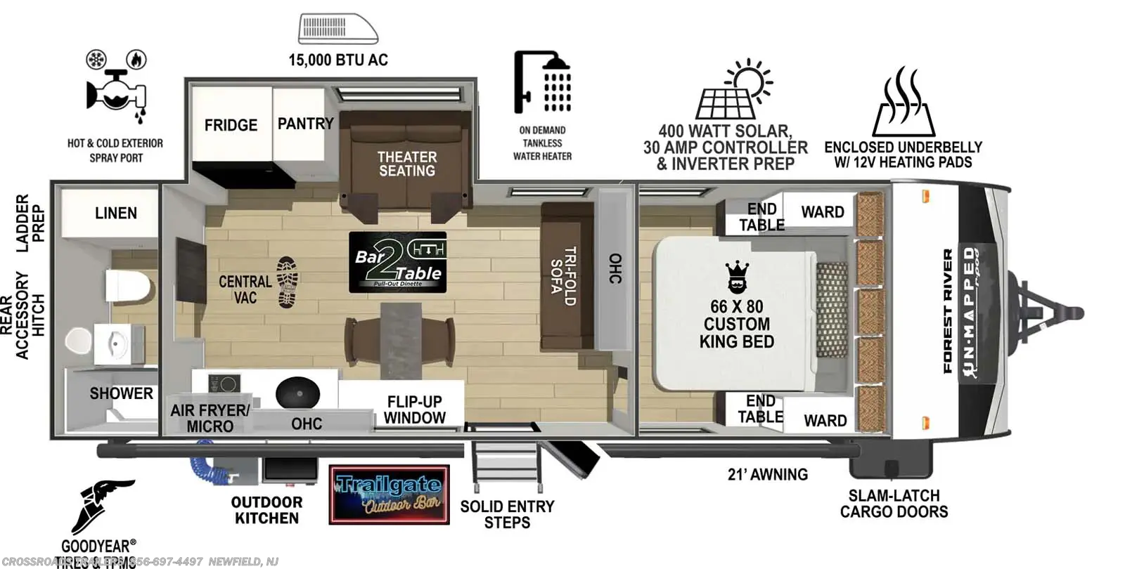 Inside, you’ll find a thoughtful flow that moves from a welcoming front bedroom to a functional mid kitchen, through a cozy mid living area, and into a private rear bath. A single slide-out widens the living space for mealtimes and lounging, while a dinette provides space for meals, work, or game nights. Equipped with a microwave, refrigerator, water heater, and an energy-friendly inverter, the trailer supports comfortable off-grid weekends. A 15,000 BTU air conditioner keeps temperatures comfortable, and the unit is prepped for a second A/C if you want peak cooling.