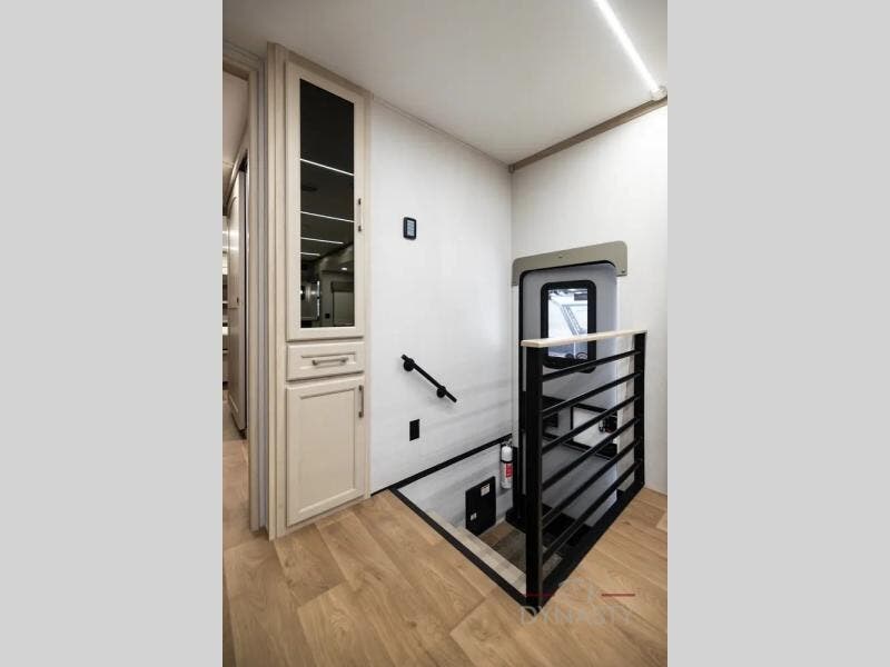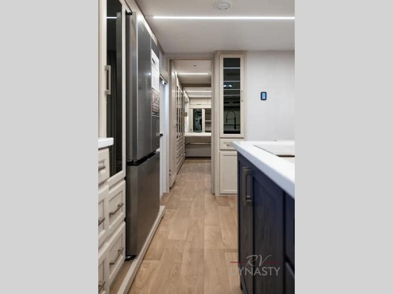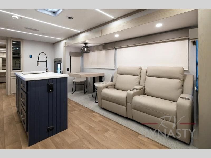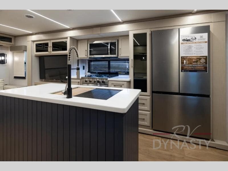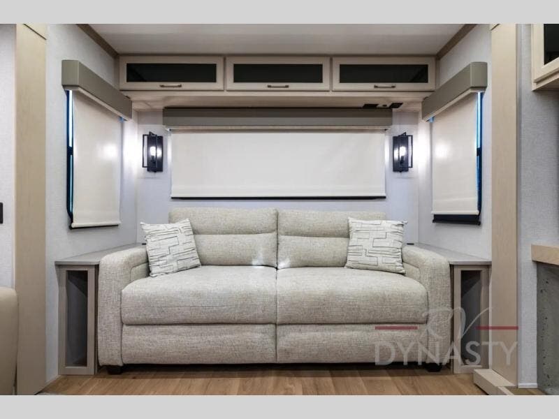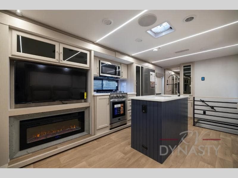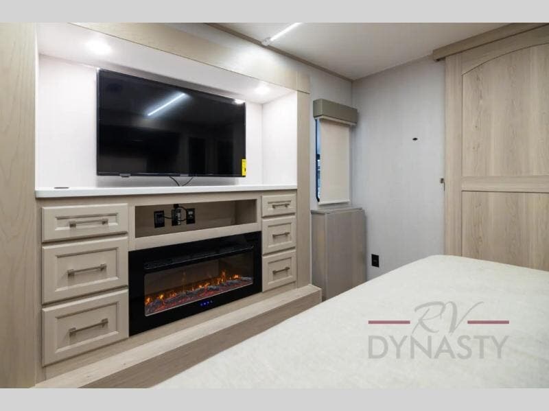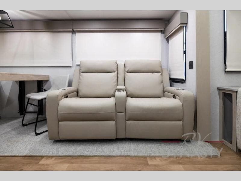 This spacious fifth wheel with four slide outs is sure to meet all your needs! Your crew can relax in the rear living area on the sofa/sleeper or the theater seat across from the fireplace and 50" TV. There is also a free-standing table with chairs with an extension where you can dine at, plus a kitchen island for more counter space in the kitchen. There is a spacious full bath with dual bath sinks so you both can get ready at the same time, and the front private bedroom will provide you with your own space in the evenings. Here, you'll find a king bed and wardrobe slide, a second wardrobe, and washer/dryer prep with a removable shelf for more storage space. Head outdoors to enjoy the two power awnings, and you can grab your hiking gear from the rear slide tray!