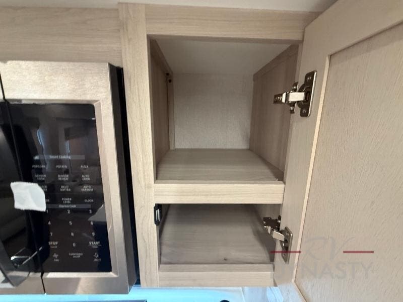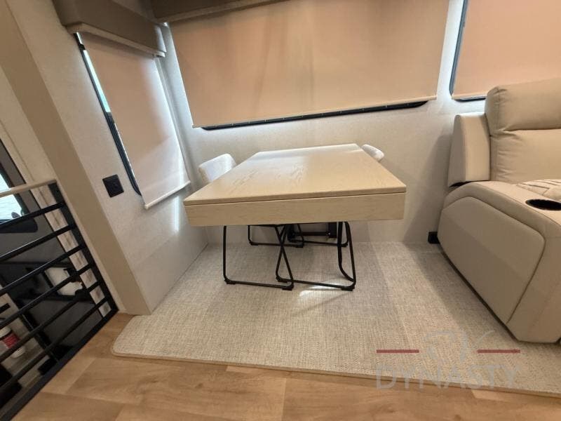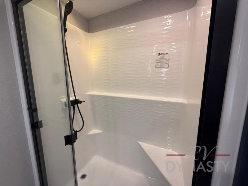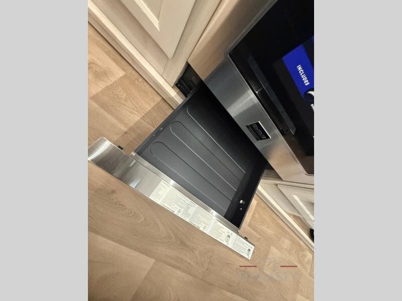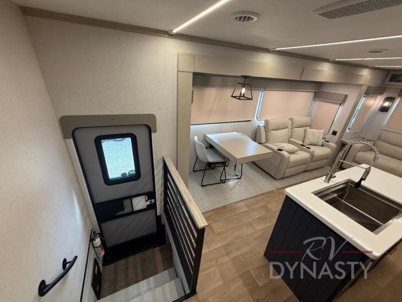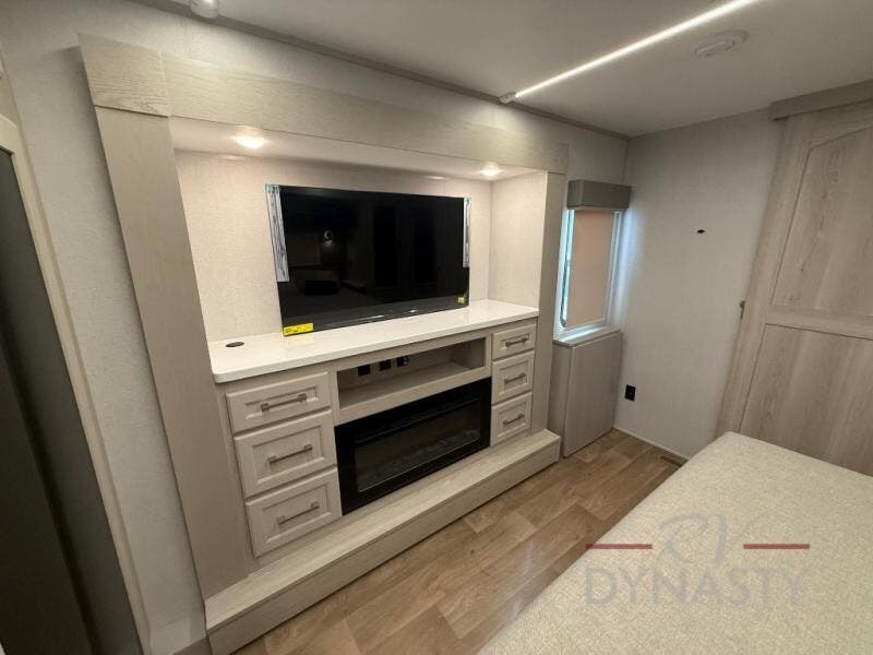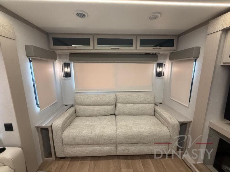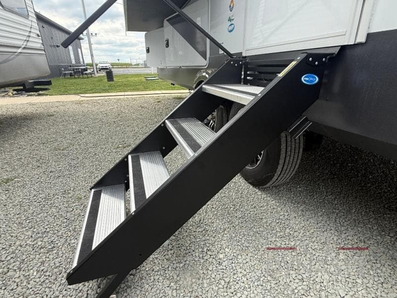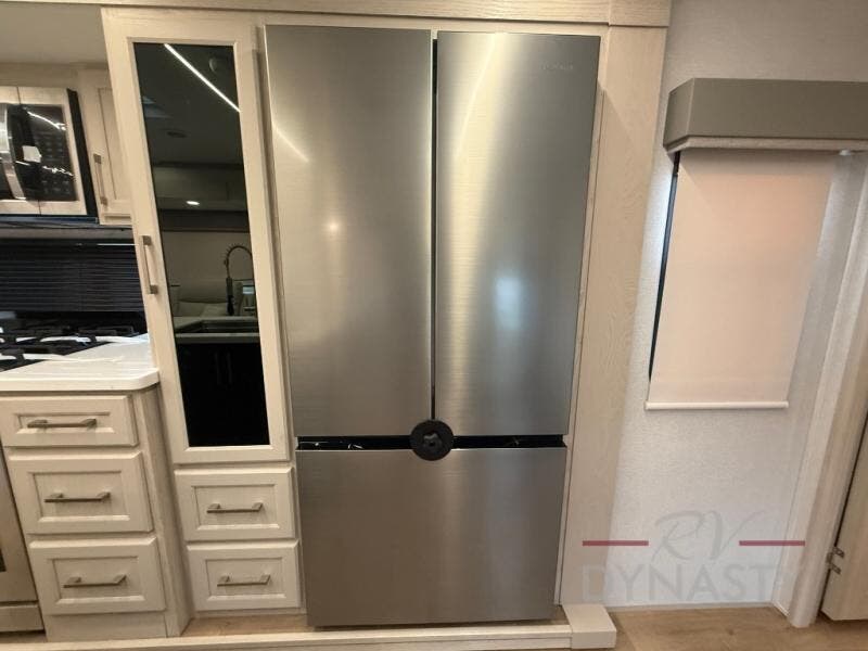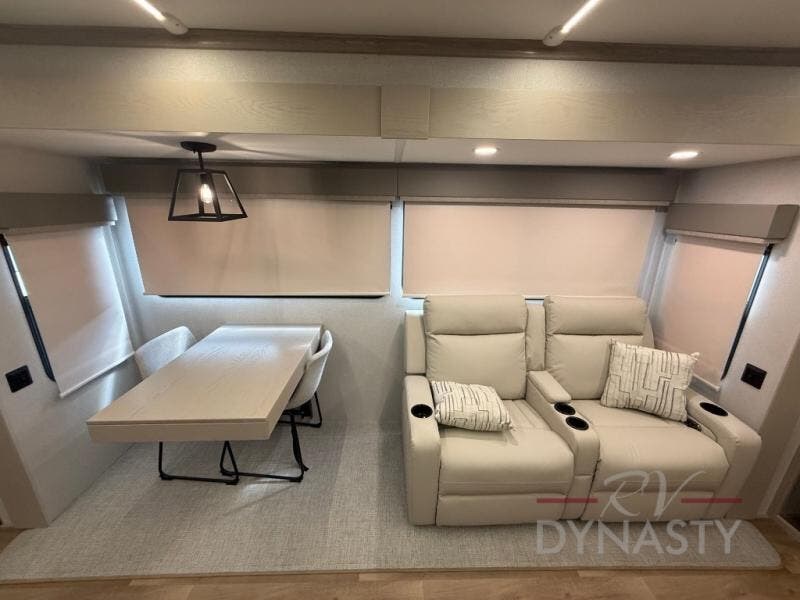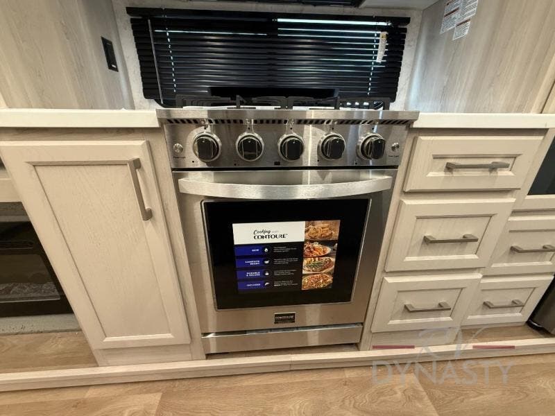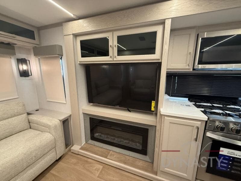 WALL MOUNTED FREE STANDING DINETTE TABLE W/DRAWER,(2) RESIDENTIAL DINETTE CHAIRS, (2) FOLDING CHAIRS, UPGRADED RESIDENTIAL HARDWARE W/ CABINETS & SOFT CLOSE DOORS & DRAWERS, LARGE KITCHEN PANTRY(SELECT MODELS), KITCHEN MAXX AIR VENT, DEEP BOWL STAINLESS STEEL KITCHEN SINK W/ACCESSORIES, STAINLESS STEEL APPLIANCE PKG INCLUDING 18 CU FT 12V REFER, 1.7 CU FT MICROWAVE, RESIDENTIAL STYLE 24" RANGE, 50" SMART TV W/BLUETOOTH AUDIO, DAY/NIGHT PRIVACY ROLLER SHADES IN MAIN AREAS, WOVEN FLOORING, POWER THEATER SEATING W/USB, TRI-FOLD SLEEPER SOFA, 5K BTU ELECTRIC FIREPLACE IN LIVING ROOM & BEDROOM (SELECT MODELS), ALUMINUM BED BASE W/KING BED, BEDROOM TV, WASHER/DRYER PREP, PORCELAIN TOILET, 48X30 ONE PIECE FIBERGLASS SHOWER SURROUND, UNDERMOUNT BATH SINK W/SOLID SURFACE COUNTERTOP, POP-UP RECEPTS