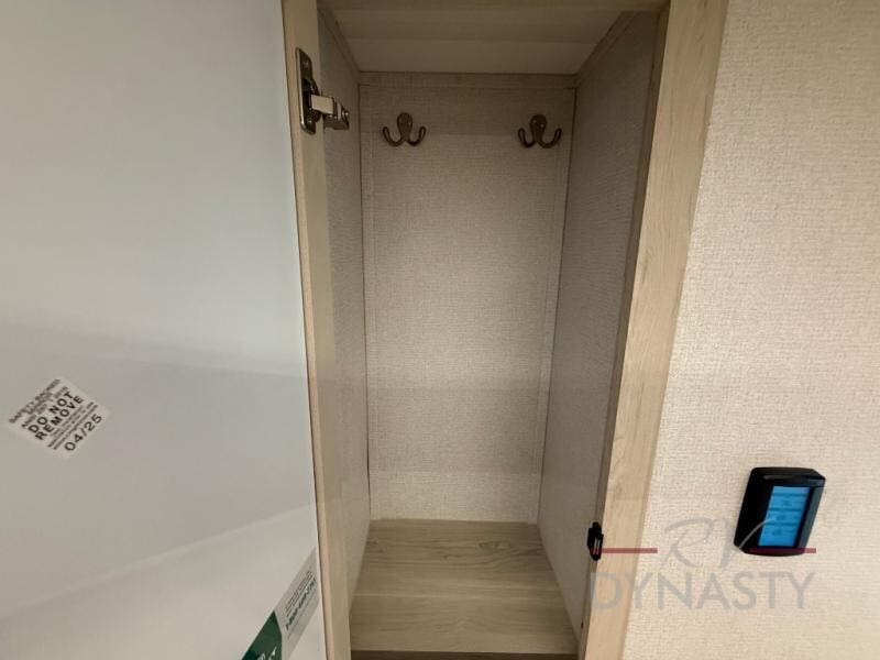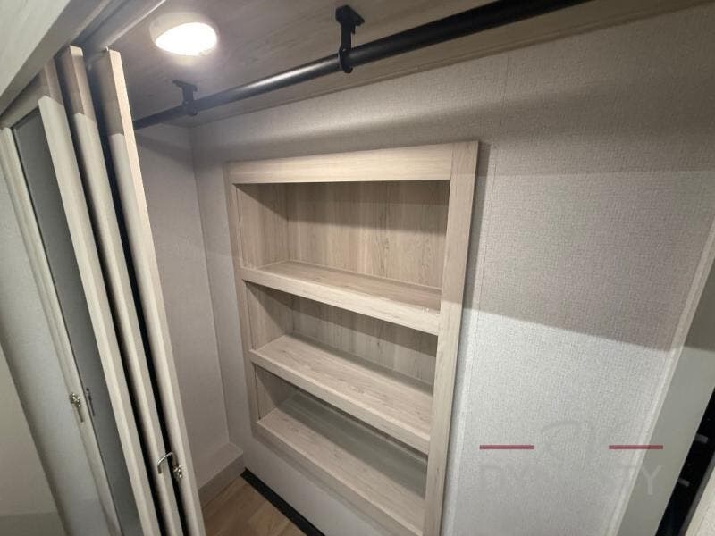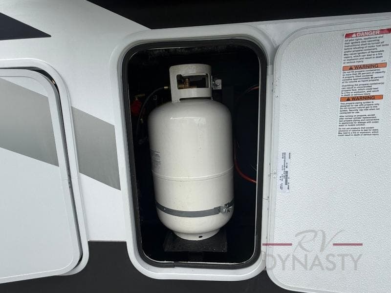 This spacious fifth wheel with four slide outs is sure to meet all your needs! Your crew can relax in the rear living area on the sofa/sleeper or the theater seat across from the fireplace and 50" TV. There is also a free-standing table with chairs with an extension where you can dine at, plus a kitchen island for more counter space in the kitchen. There is a spacious full bath with dual bath sinks so you both can get ready at the same time, and the front private bedroom will provide you with your own space in the evenings. Here, you'll find a king bed and wardrobe slide, a second wardrobe, and washer/dryer prep with a removable shelf for more storage space. Head outdoors to enjoy the two power awnings, and you can grab your hiking gear from the rear slide tray!