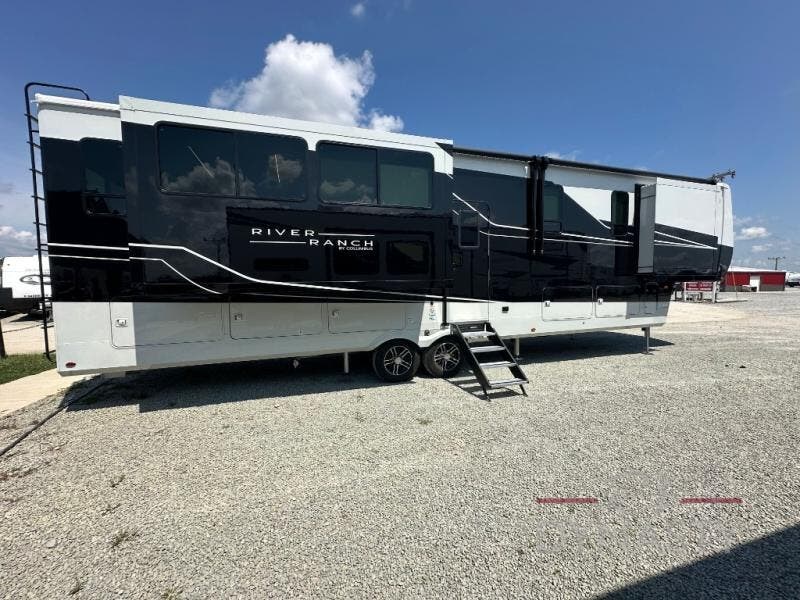 With the River Ranch fifth wheel by Forest River, you will love the practical living, ample storage, the optimum towability, and the lavish style found throughout! There is a 7' interior height and a 101" wide body for added space, plus large, tinted windows throughout, worry-free composite floors, and vacuum bonded walls with Azdel for durability. The mandatory River Package includes features such as an upgraded suspension, a screenless operating system with Bluetooth, and three A/C units to keep you comfortable. These fifth wheels also include the mandatory Ranch Package that comes with a stainless-steel appliance package, day/night roller shades, a fiberglass shower surround, plus residential style dinette chairs. There are many more features to love about the River Ranch fifth wheels, like the upgraded true solid surface countertops, the mirrored sliding closet doors, and the two-tone painted front cap!